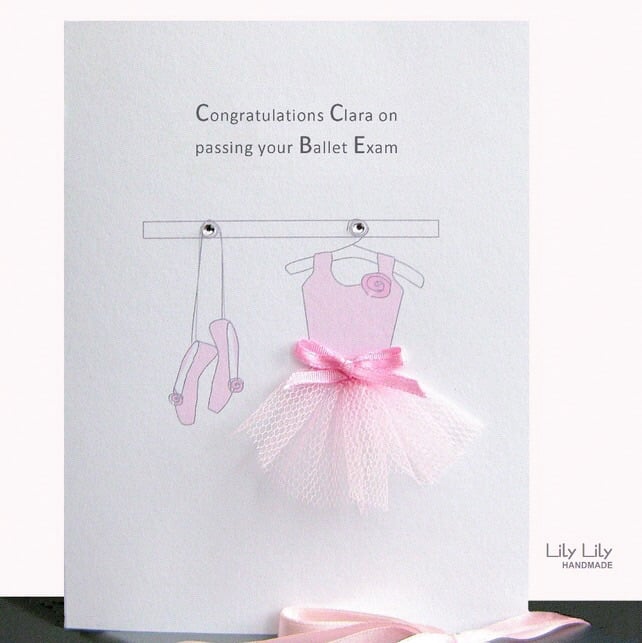 Sending a card is a lovely way to congratulate someone - for example on passing their ballet exam. The design of this card by Lily Lily Handmade, is of a ballet costume, including ballet pumps and a 3D delicate pale pink ballerina tutu, embellished with light pink satin ribbon & clear rhinestones.