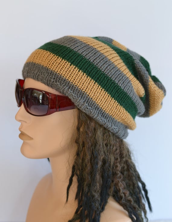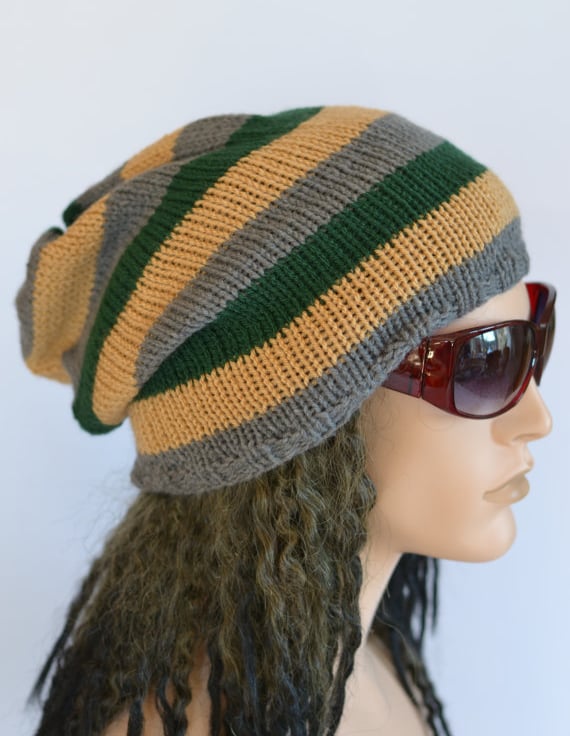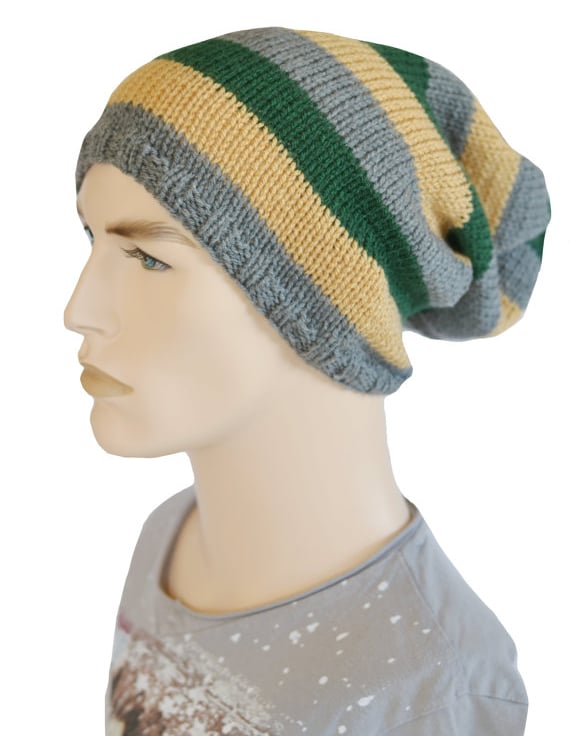 knitted slouchy beanie hat In 100% acrylic in grey, green and caramel.