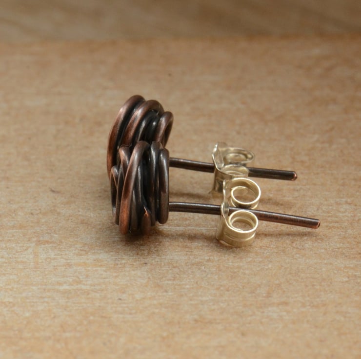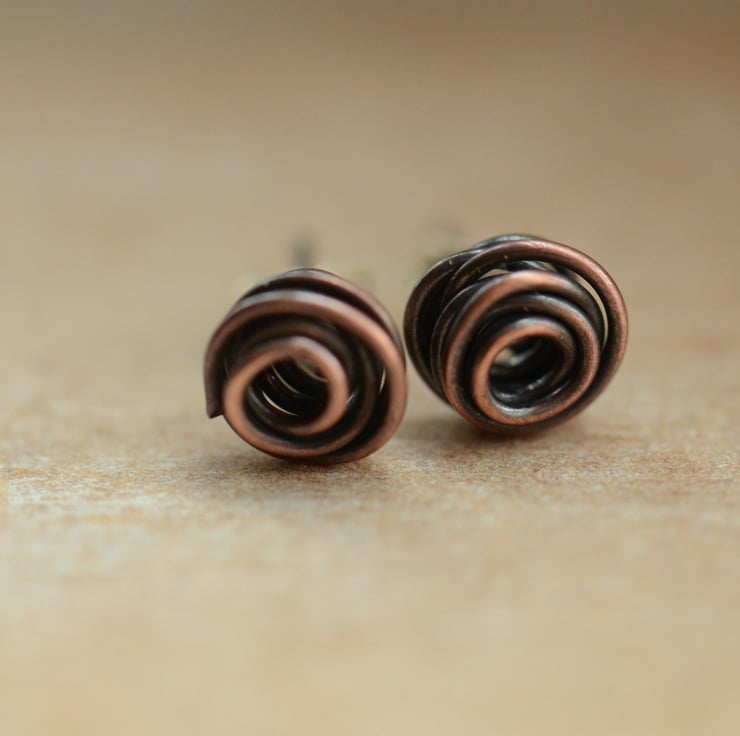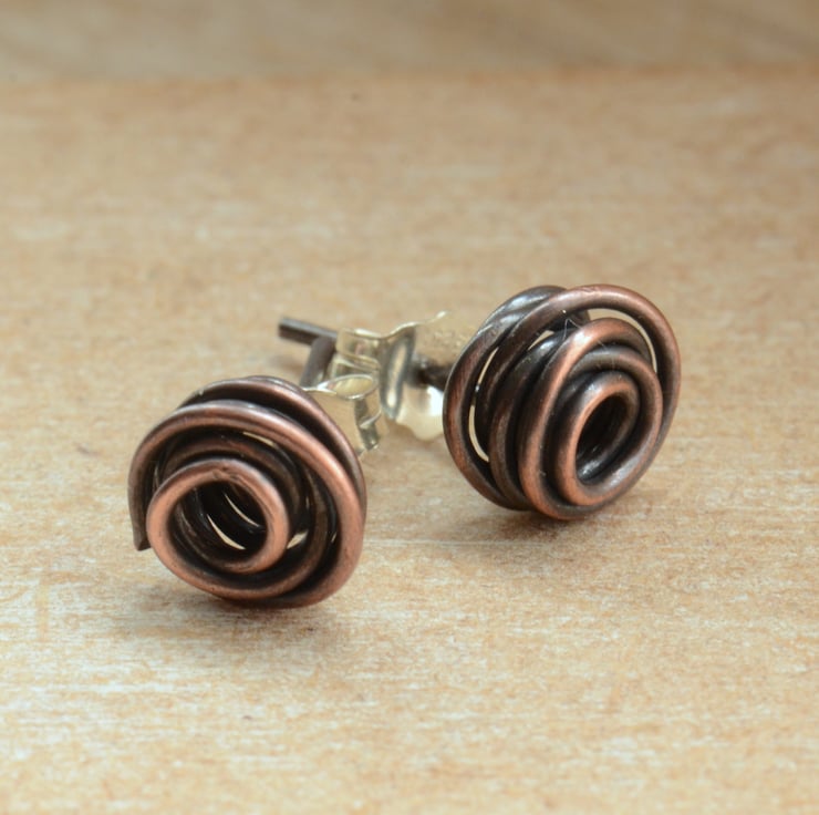 Beautiful handmade copper stud earrings, handmade from pure copper wire which has been wrapped to resemble little roses, tumbled, oxidised to give an aged look and polished, complete with sterling silver backs.