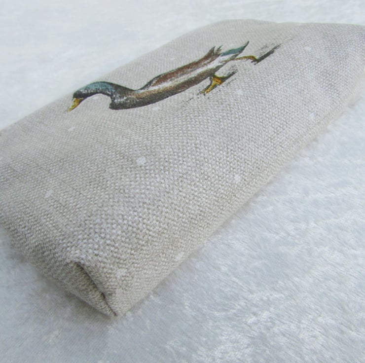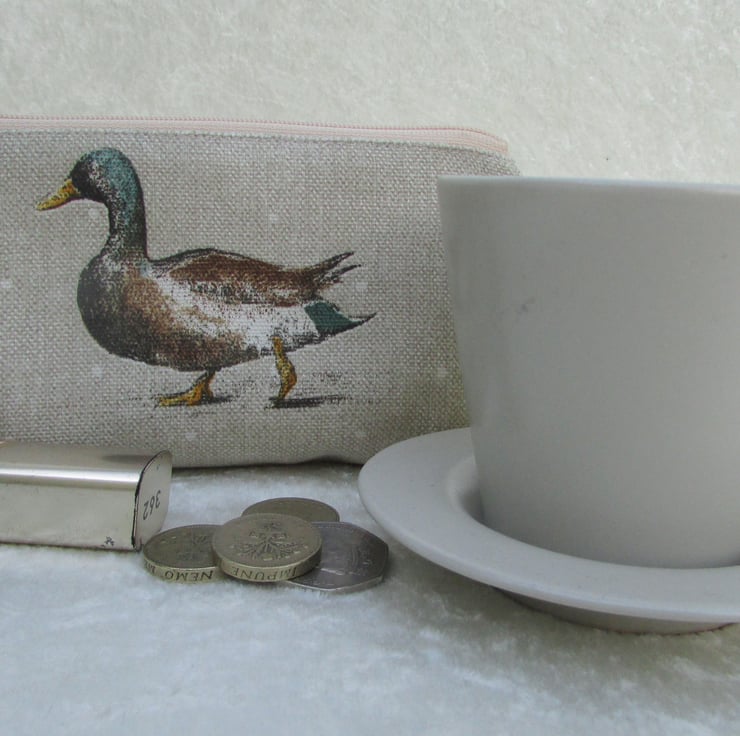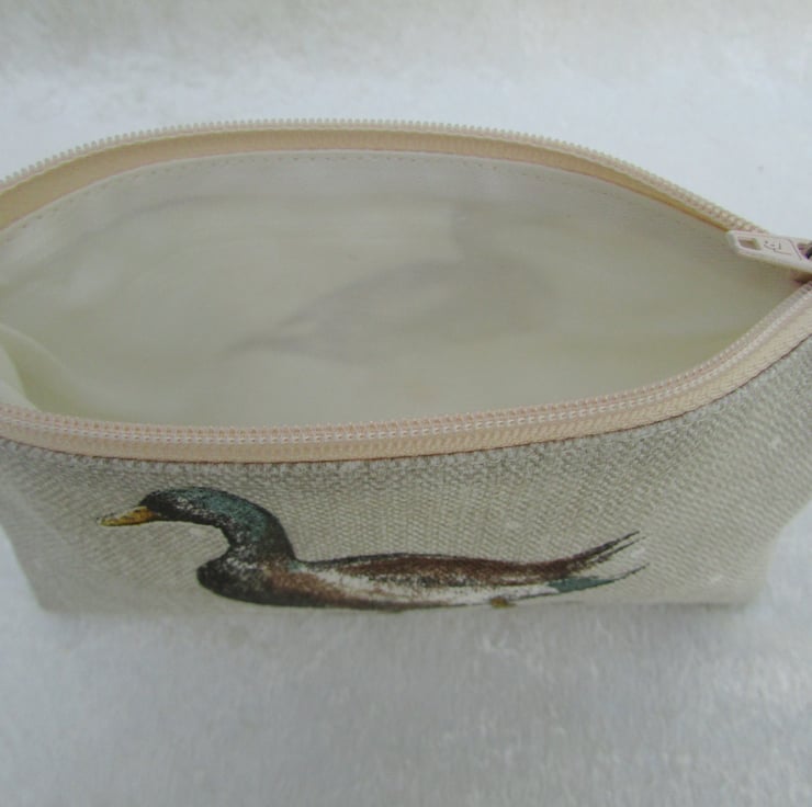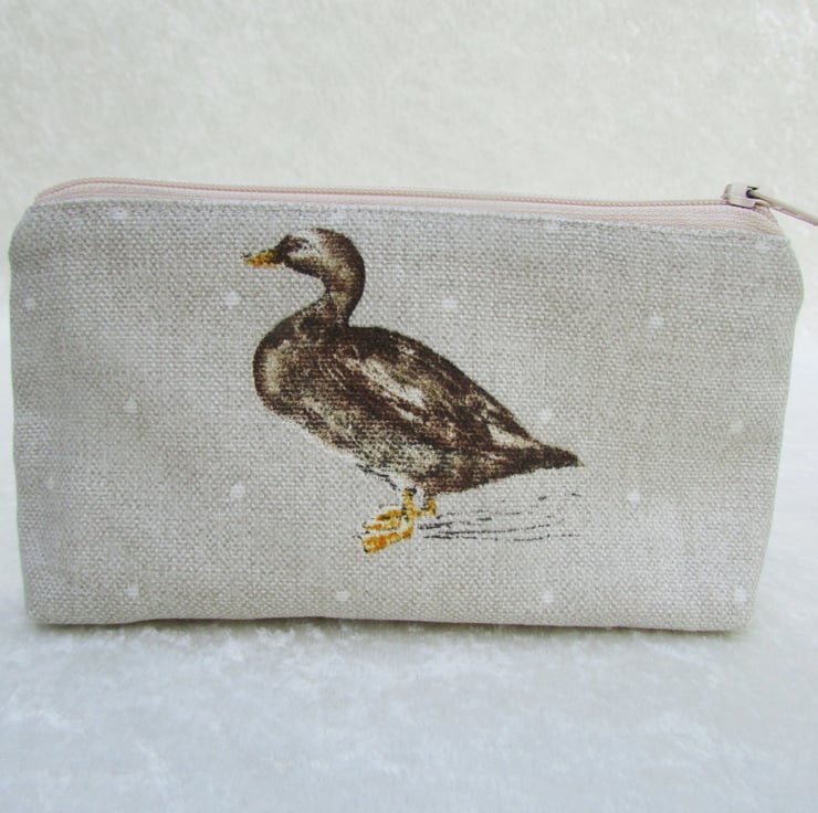 A large purse in a delightful print fabric in pale beige with white polka dots featuring a Mallard drake on one side and a Mallard duck on the other. The purse is lined with cream fabric and has a cream zipped fastening. The base of the purse is boxed to give plenty of room inside.