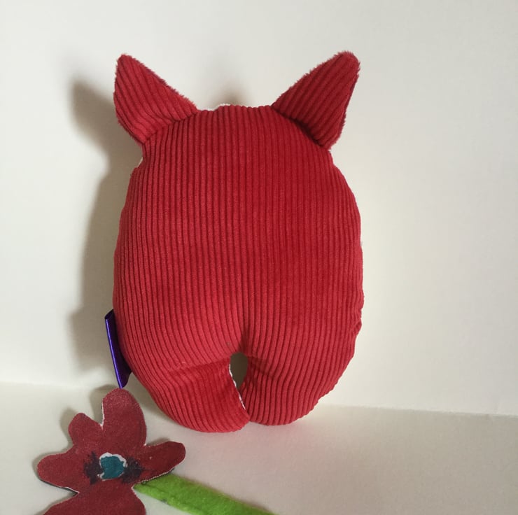 22cm from head to toe. Super soft white embroidered corduroy with raspberry plush face, ears and backed with super soft orange corduroy. Grey plush hands with stitched silver plush dandelion between. Black plush nose.