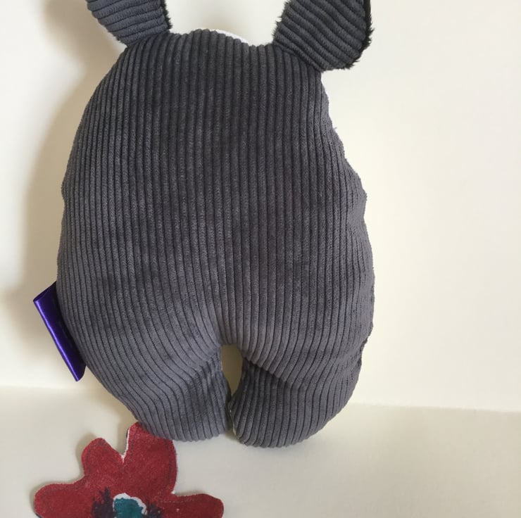 22cm from head to toe. Super soft white embroidered corduroy with black plush face, ears, hands with super soft grey corduroy backing.