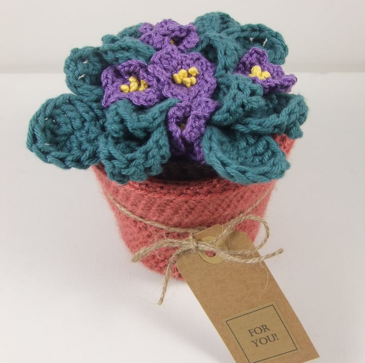 The pot is crocheted around a real plastic plant pot in terracotta yarn. the internal measurements after covering are approximately 8 cm in height by 8.5 cm diameter at the top. The lid is made from a circle of strong card covered with crocheted soil and under the lid and a circle of brown felt hand-stitched over the crocheted on the underside. The flowers and leaves have been crocheted and embroidered in cotton and the inside of the pot is lined with calico. The label tied around the pot reads ‘For You’ but I’m very happy to exchange this for a tag with a greeting of your own.