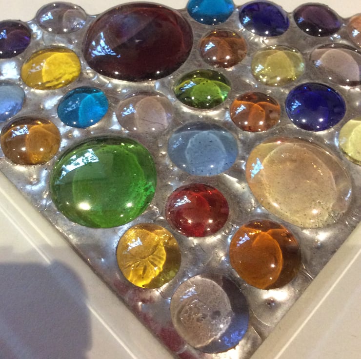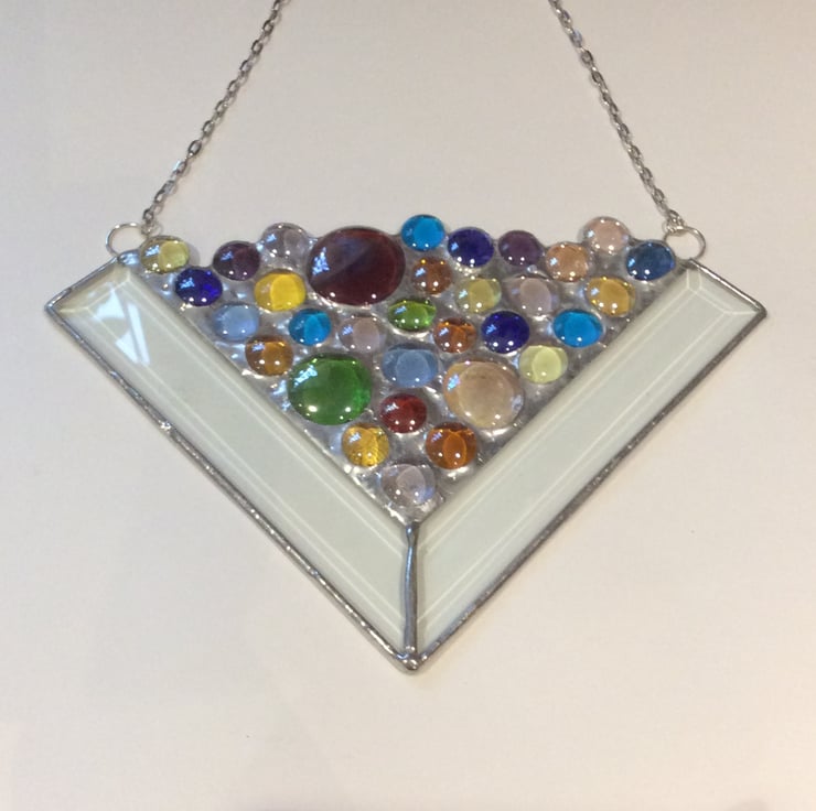 This is the bigger brother to the other similar suncatcher that I listed today . This one measures approx. 280mm across and has wider bevels and many more glass nuggets . Every nugget and edge bevel has been wrapped in copper foil and then solidly soldered , cleaned and polished .