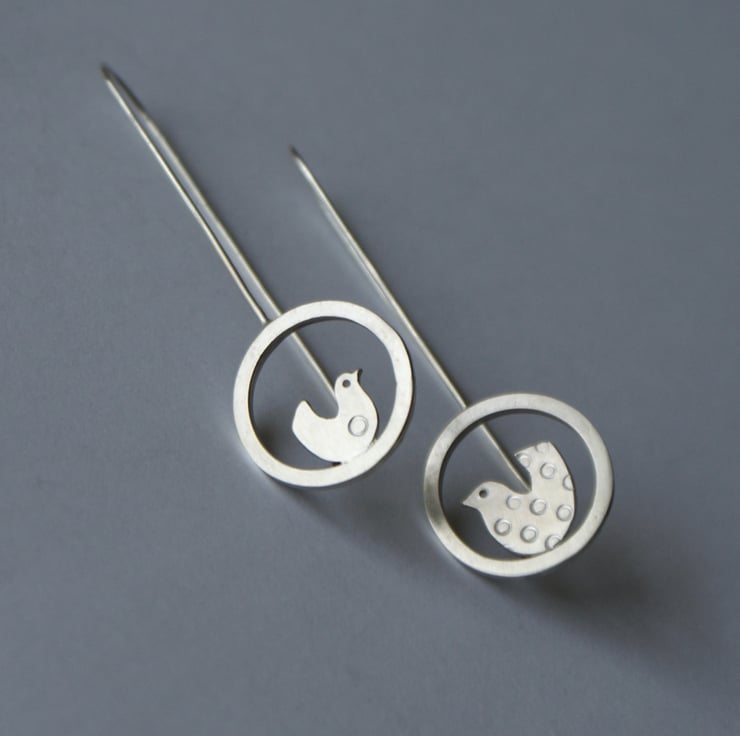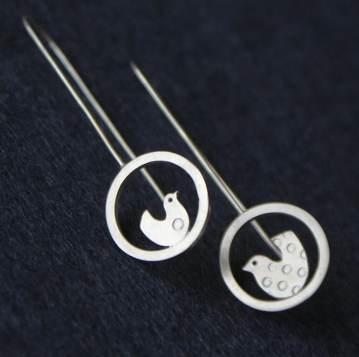 A cute pair of sterling silver drop earrings hand made by me. The birds are hand cut and set within a circle made of square wire. The birds were meant to be chickens but didn't turn out quite as planned hence the name! The finish is a satin silver but can be polished to a shiny finish, just let me know when ordering. Please note each pair may vary very slightly from the image.