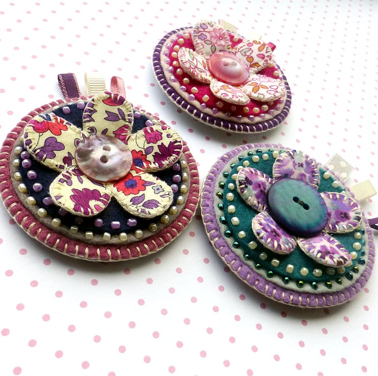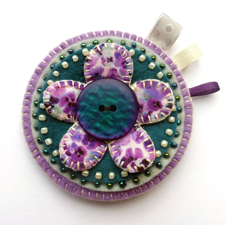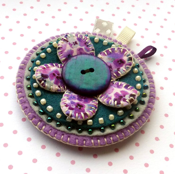 The fabric flower is in beautiful Liberty of London fabric. It has been stitched onto a teal circular felt base. This has then been backed by light grey and lilac felts and features seed beading around the circumference. It has been finished with a large central teal button and three little ribbon tag details in coordinating colours. There is a metal brooch pin on the reverse side for easy attachment.
