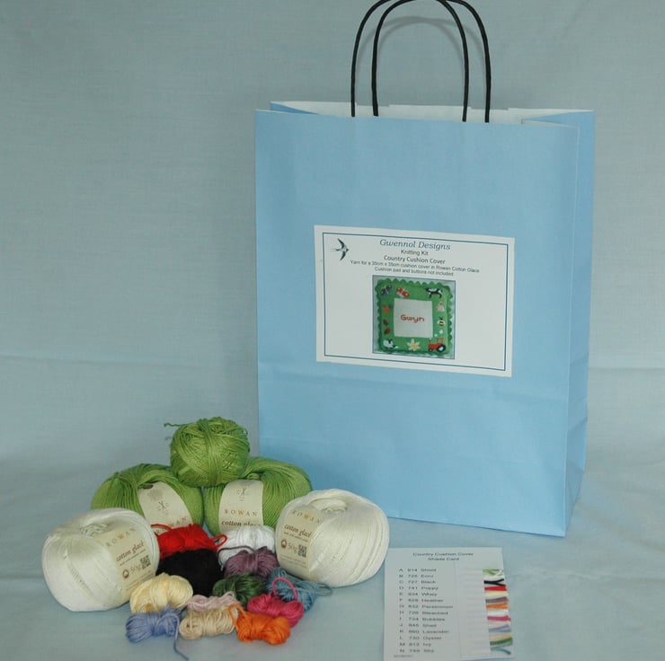 Rowan Cotton Glace 100% cotton in 14 shades and sufficient quantities to knit and sew up the cushion cover. Please be aware that some of the shades in the pattern may have been discontinued but I will substitute with a similar shade and a note in the kit will clearly indicate the substitution.