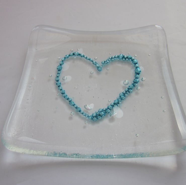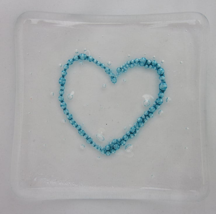 This square trinket bowl has a clear base with an enclosed deep blue bubble heart design and is approximately 10cm across. Though designed as a trinket bowl, it might also make a great soap dish, the bubbles would look good in this environment. An ideal present for someone you love.