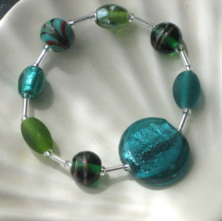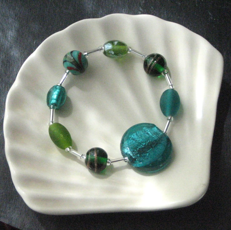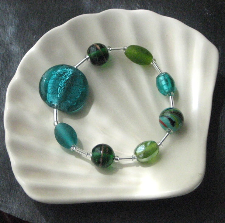 Glass bead bracelet in green glass, lampwork and ceramic beads, elastic stretch. I have made up this bracelet using some varied and beautiful green glass and ceramic beads, joined with silvered glass tube beads. Threaded with elastic for ease of wear, this would add an accent of colour and sparkle to any outfit and would make an inexpensive little gift for a friend. To fit a small or medium adult wrist.