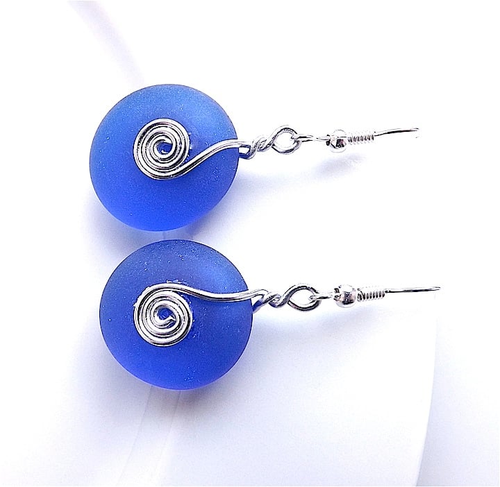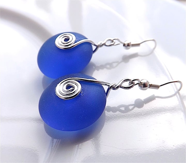 beach found sea glass dangle earrings, sizes including hanging and earwires, length 45 mm ( 4.5 cm ) sea glass 20 X 18 mm, depth of sea glass 8 mm, spiral hanging and ear wires silver plate. I love sea washed glass and spend many happy hours beach combing to find these treasures and to find near matches is very difficult, making all these stunning earrings very unique and special. Finished in tumbler for a really smooth silky finish.