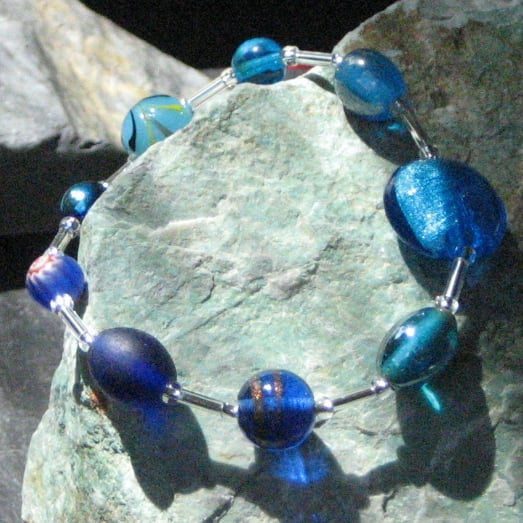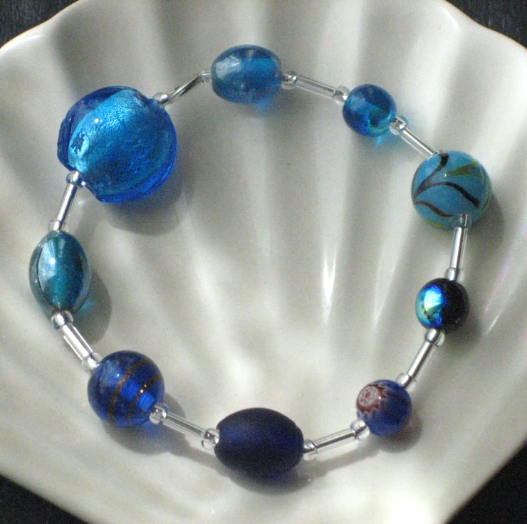Blue glass and ceramic stretch beaded bracelet. I have assembled this pretty bangle from a selection of beautiful blue glass and ceramic beads, joined together with silvered tube beads. Strung on elastic for ease of wear, it will add a striking accent to any outfit. An inexpensive little gift for a friend, or treat yourself....This bracelet will fit a small or medium adult wrist.