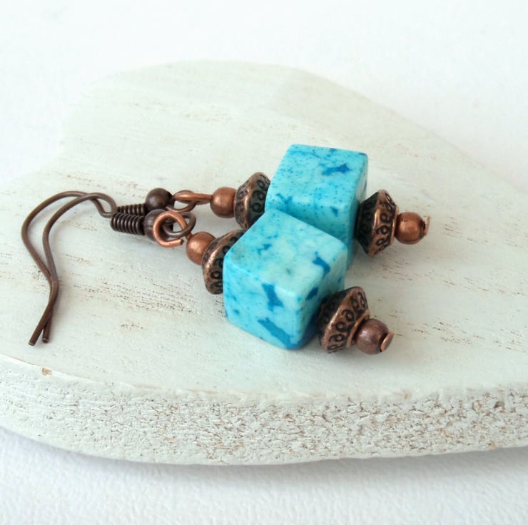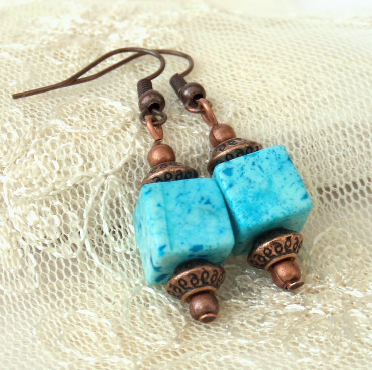 Stunning blue jasper cubes hang from copper wires, alongside copper beads.