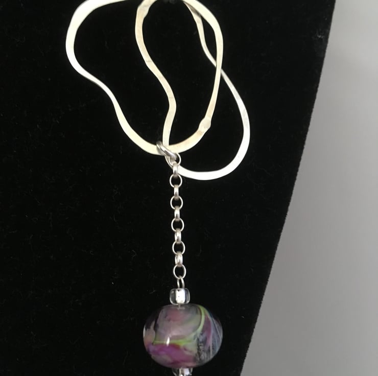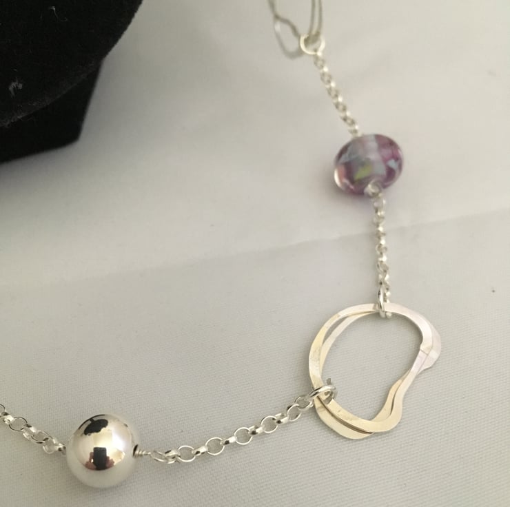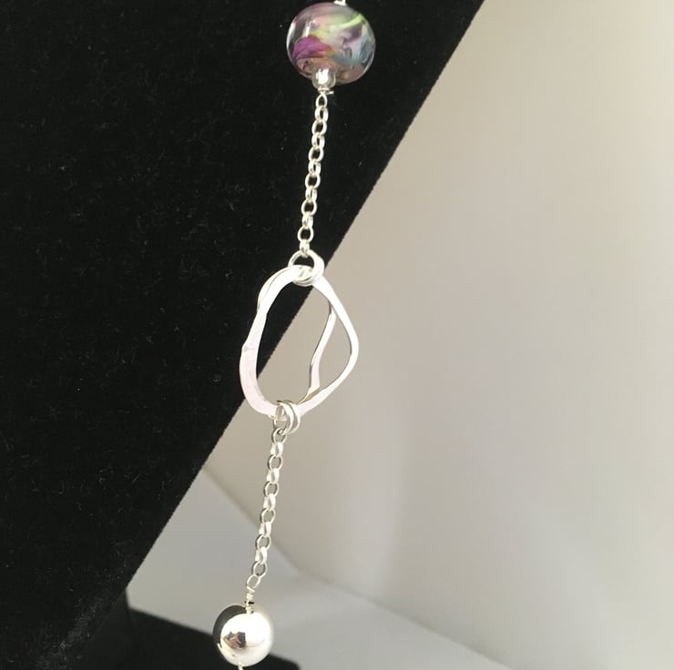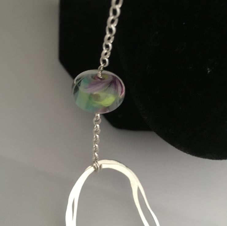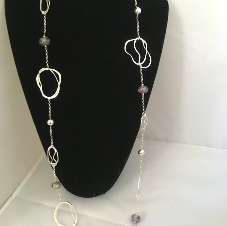 Long necklace with beaten silver loops, silver beads, silver chain and handmade glass beads.