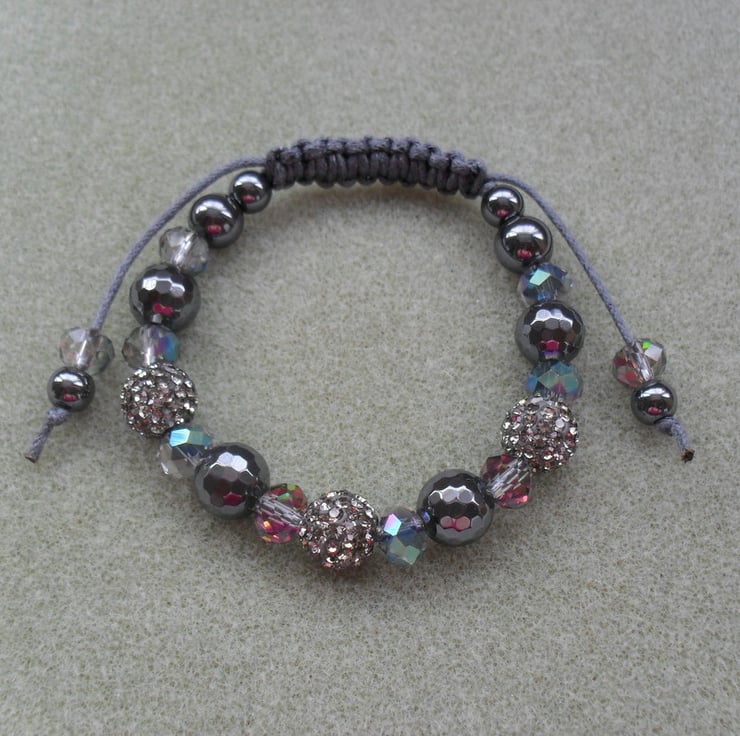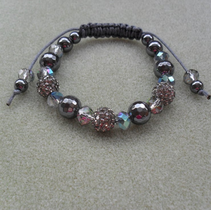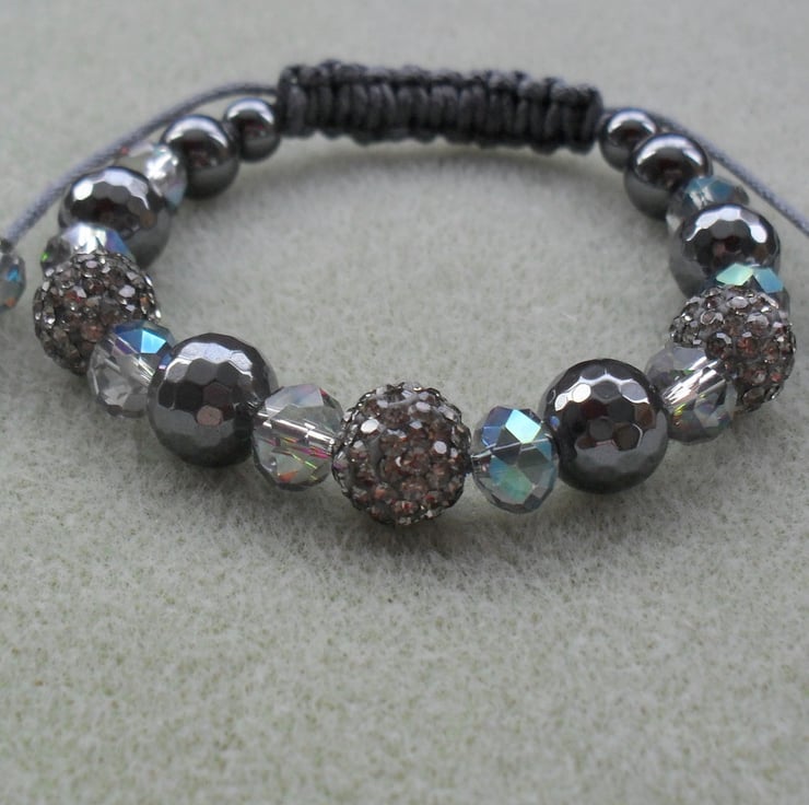 haematite beads with crystals which are clear and silver in colour and have a rainbow of colour in the light. The bracelet also has round beads which are covered with tiny crystals.This bracelet has plenty of sparkle.
