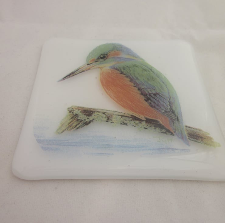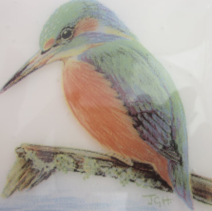 This coaster has a beautiful kingfisher design on white glass. It has been fully annealed to make it strong and is suitable for use with hot tea or coffee cups but not pans straight from the oven. It would make a great gift, secret santa or stocking filler.