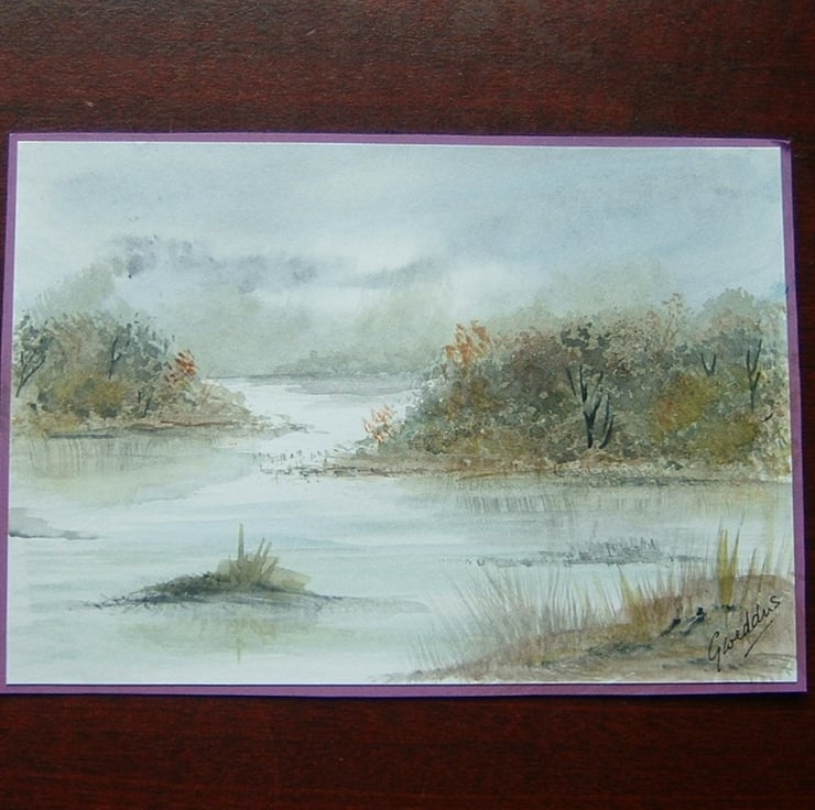 The painting is mounted onto plum coloured card giving a tiny edging to it.