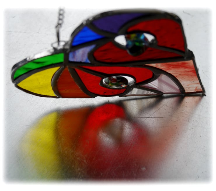 This is a stained glass suncatcher made using the Tiffany copper foil technique.