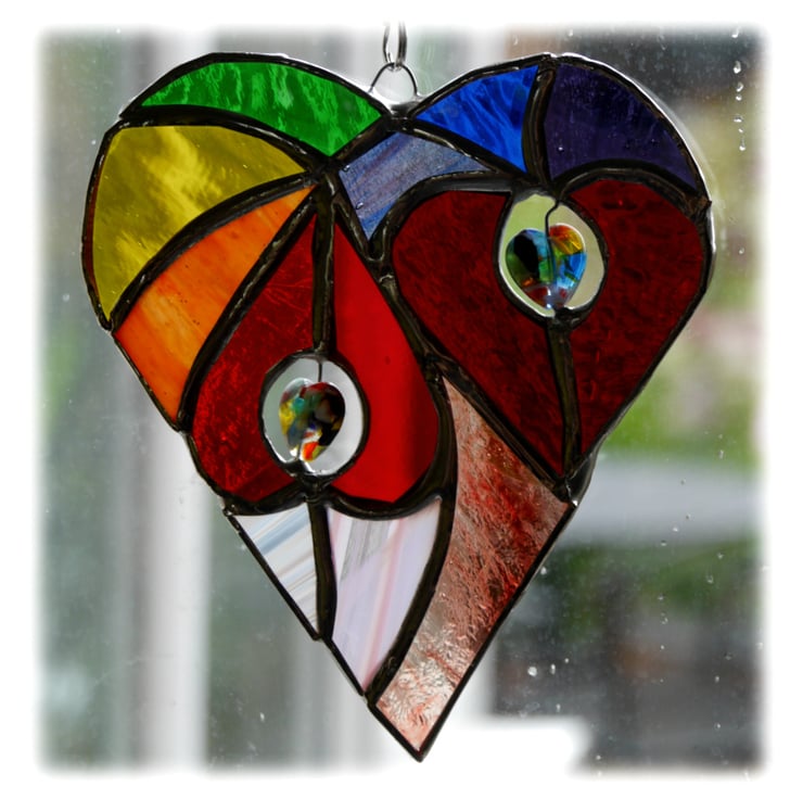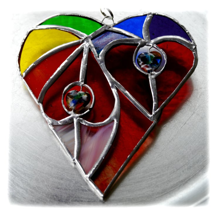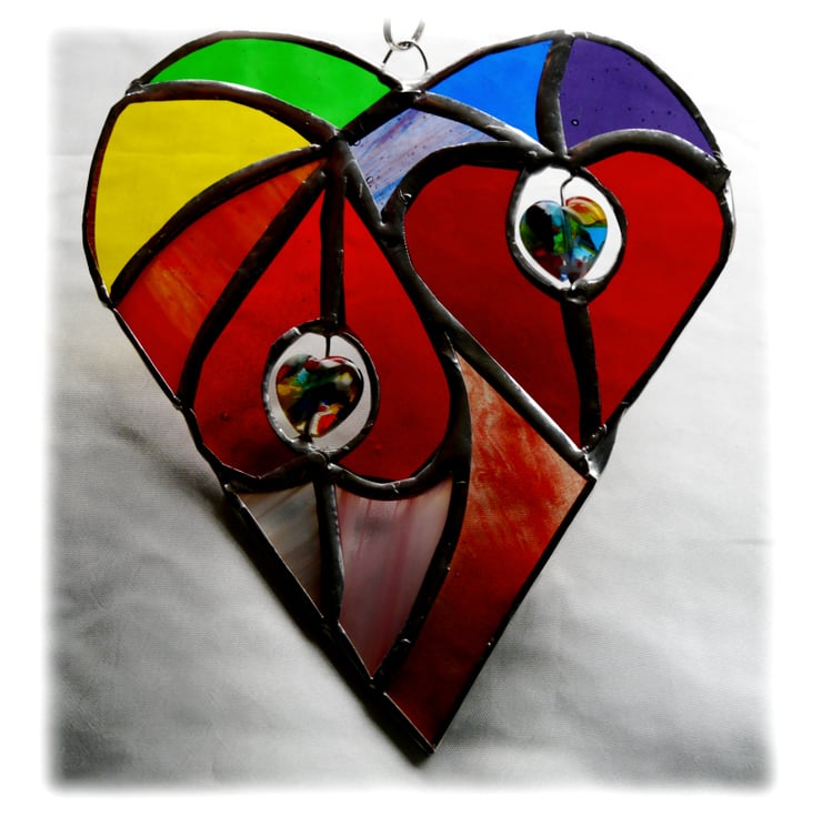 It is a big heart containing 2 smaller, bright red hearts which are surrounded by different shades of glass in all the colours of the rainbow.
