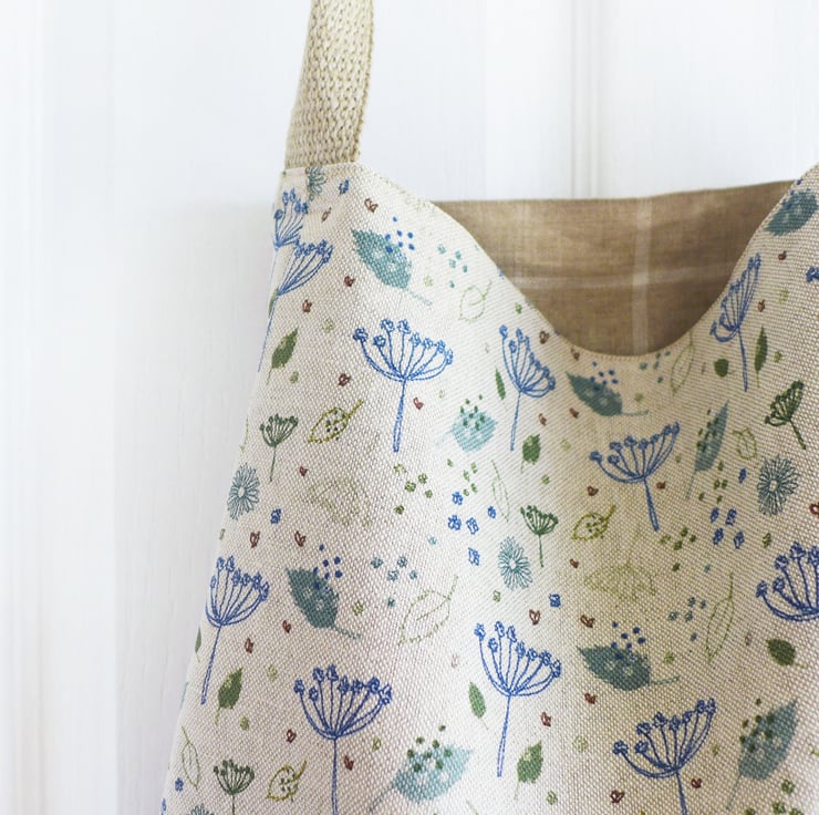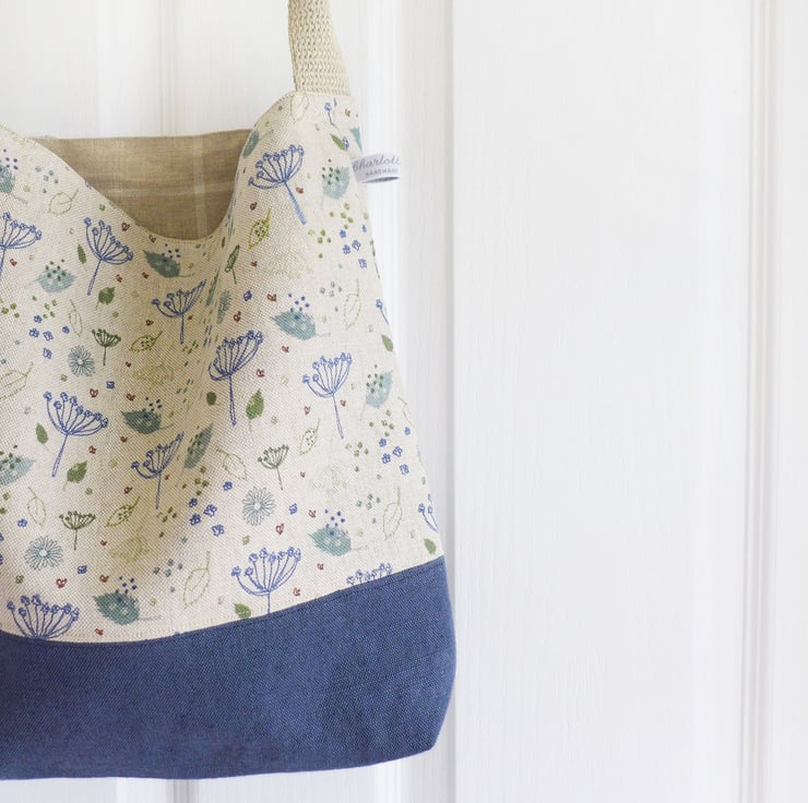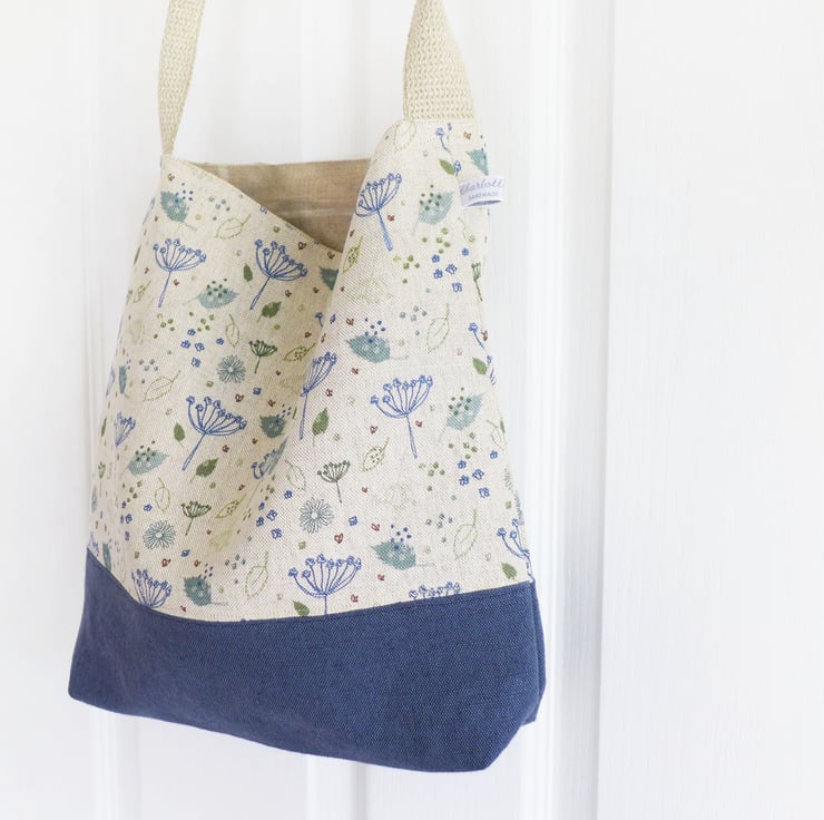 A shoulder bag perfect for day-to-day use and handmade from Charlotte's natural Blue Parsley fabric. The print is developed from her original floral embroideries, and the fabric is a versatile linen and cotton blend. This day bag is fully lined with a natural linen, has a navy blue linen square-shaped base, and a webbing shoulder strap that softens with wear. This is the perfect shoulder bag to take to the shops or out for coffee.