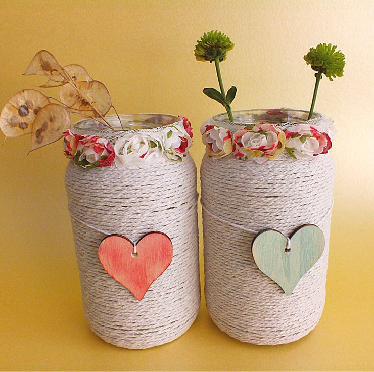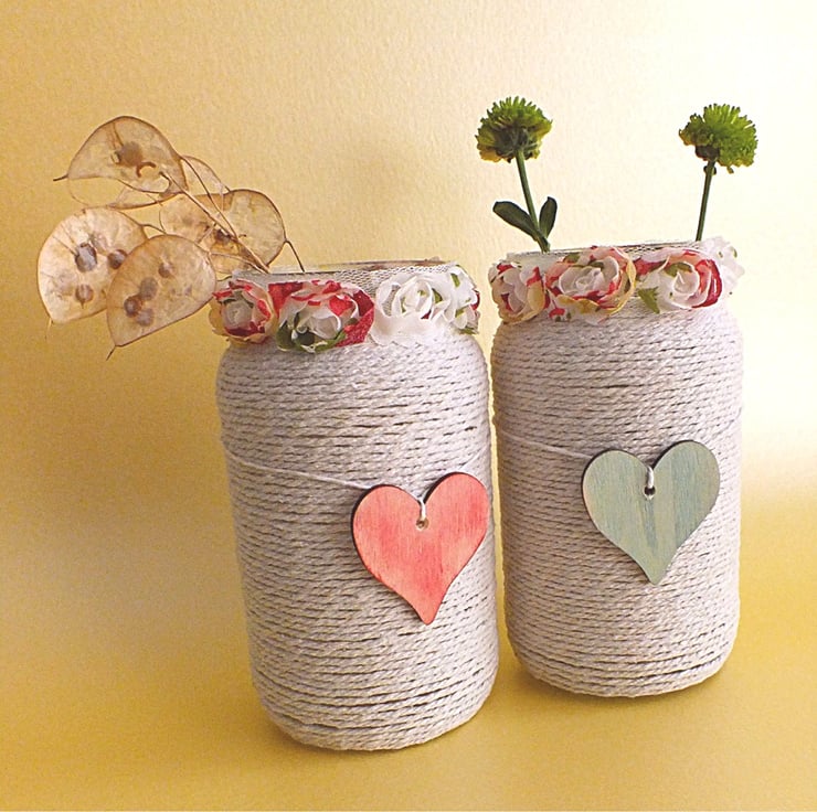 This gorgeous pair of glass holders have been wrapped in string and a flowery trim, with a painted wooden heart as a finishing touch. Approx 15cm tall and 5.5cm in diameter, these little jars can be put to many different uses - vases for fresh or paper flowers, pots for mini kitchen items (teaspoons, wooden stirrers etc), holders for paint brushes or knitting needles etc.