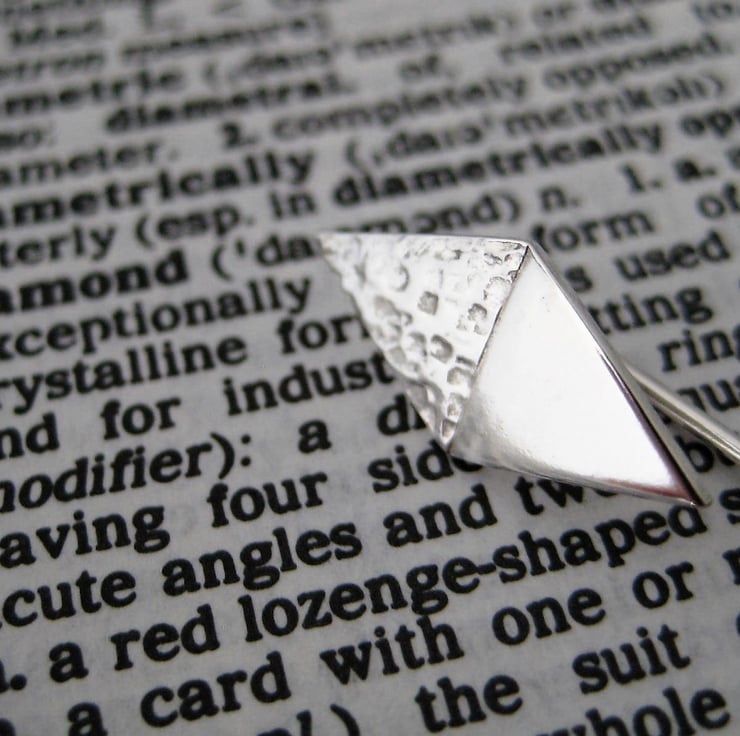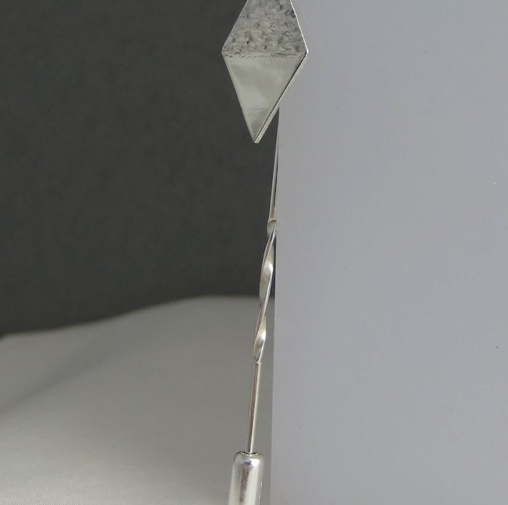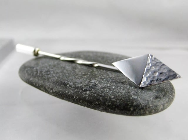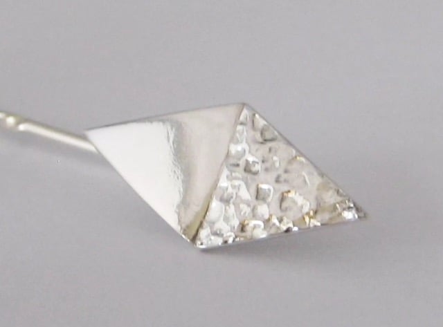 Cut out by hand from solid 1mm thick silver sheet then hammered the top to create a unique sparkly textured surface with bottom half worked to a contrasting plain/smooth surface. Set onto a twisted pin and secured with a push-on pin protector.