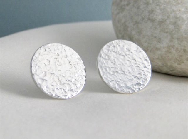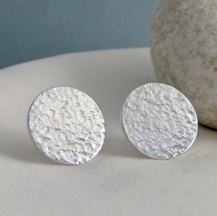 Sterling Silver Round Disc Ear Stud Earrings 15mm Hammered-Sparkly - Handmade UK
