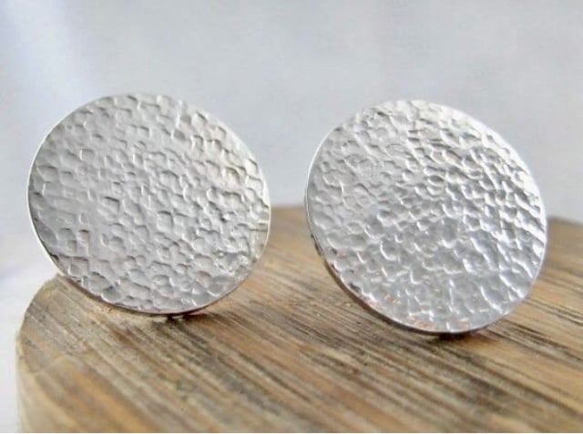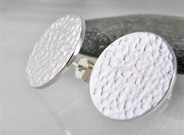 A pair of round disc ear stud earrings handmade from 925 sterling silver. Cut out by hand from solid 1mm thick silver sheet then hammered to create their unique attractive sparkly textured surface. They have long silver pin fittings in the centre and are secured with stamped (925) silver scroll’s /butterfly’s