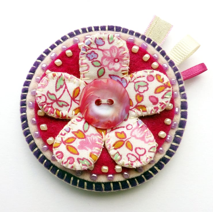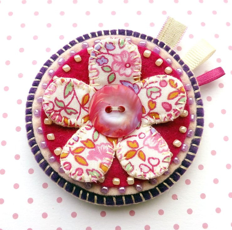 The fabric flower is in beautiful floral print fabric. It has been stitched onto a fuchsia circular felt base. This has then been backed by light pink and purple felts and features seed beading around the circumference. It has been finished with a central button and three little ribbon tag details in coordinating colours. There is a metal brooch pin on the reverse side for easy attachment.