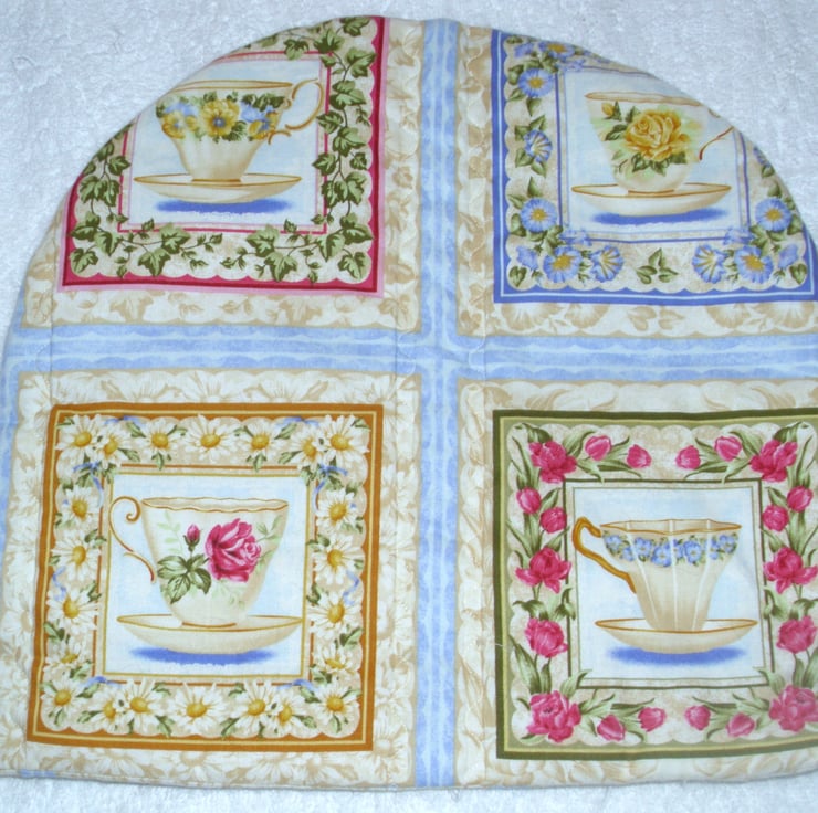 Pretty Tea cups in squares tea cosy, four different tea cups with dainty floral designs in squares on a cream background .Size 26.5 cm wide 26 cm high . will keep tea hot upto half an hour after you make it , fully washable