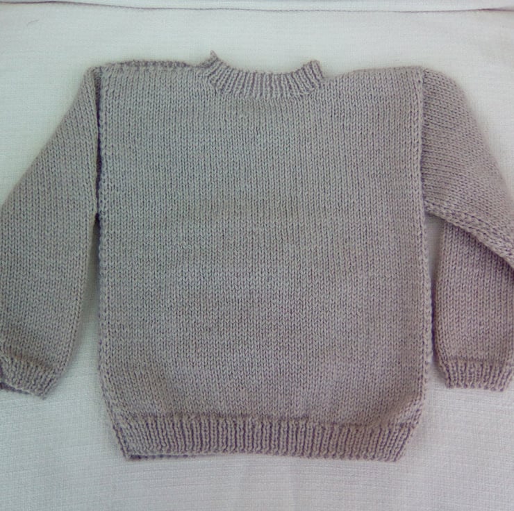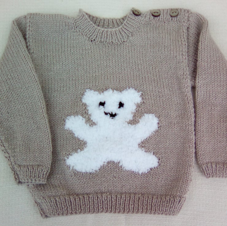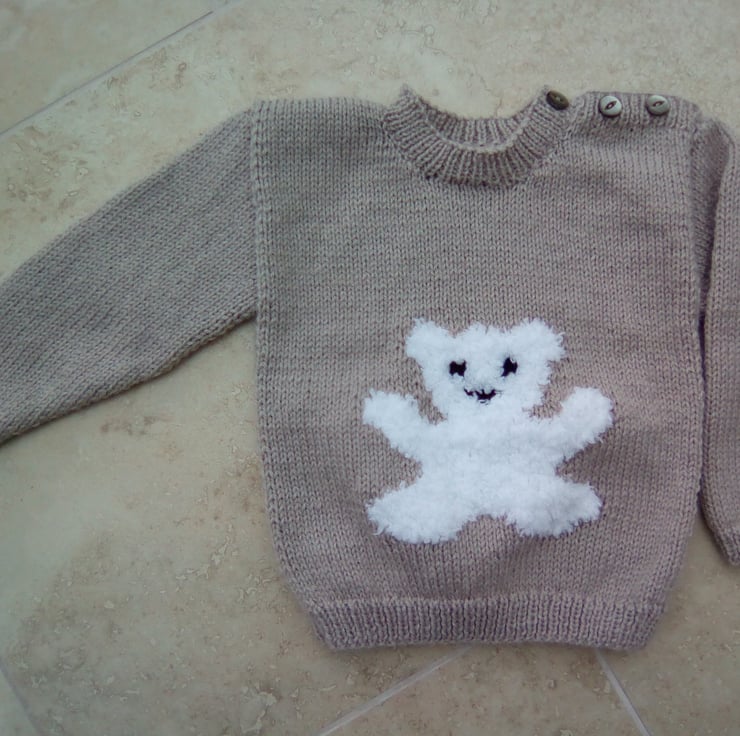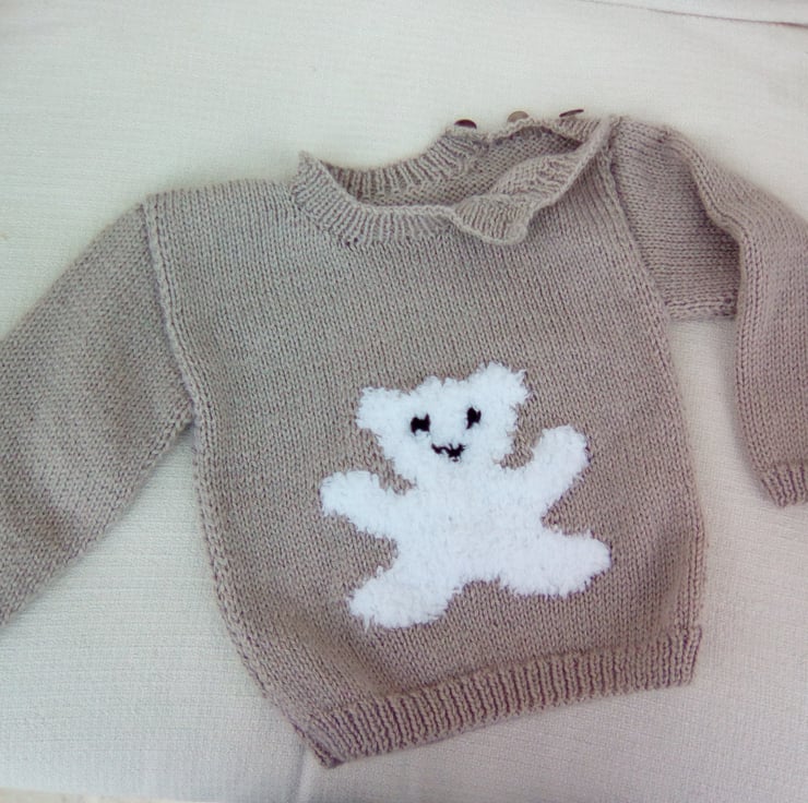 It is hand knitted in a machine washable soft baby double knit yarn. It is in a neutral stone colour suitable for either a boy or girl. The eyes and nose are also knitted. The back is plain.