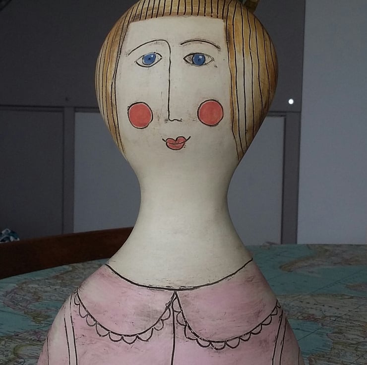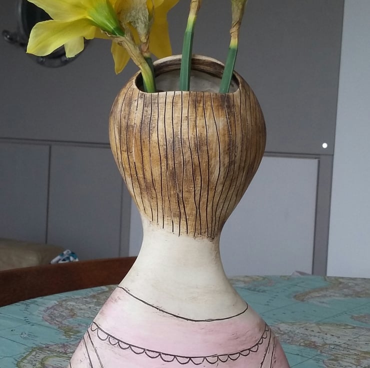Hand made from earthenware clay and painted with coloured slips. Rosie is 25cm in height.Back view show small opening for dry or artificial flowers .Filling with water is not recommended .Will be carefully packed and posted.
