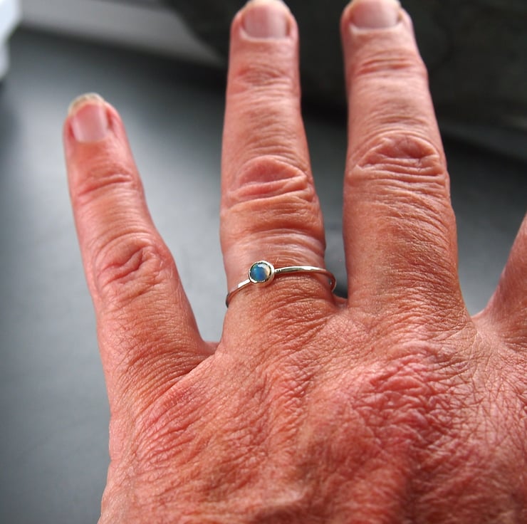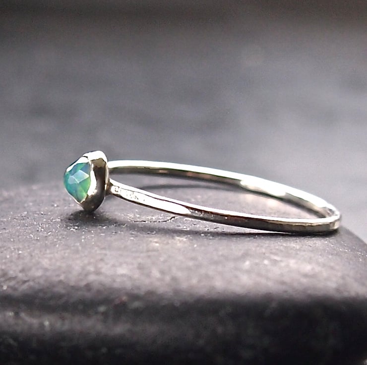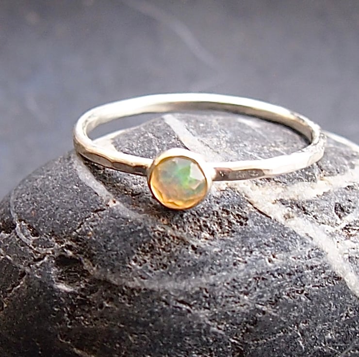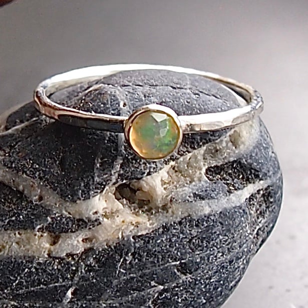 One of our delicate skinny rings hammered for texture with a bezel set Ethiopean opal. The opal is 4mm and rose cut for a beautiful sparkle. These are lovely quality stones with a good play of colour specially imported by us.