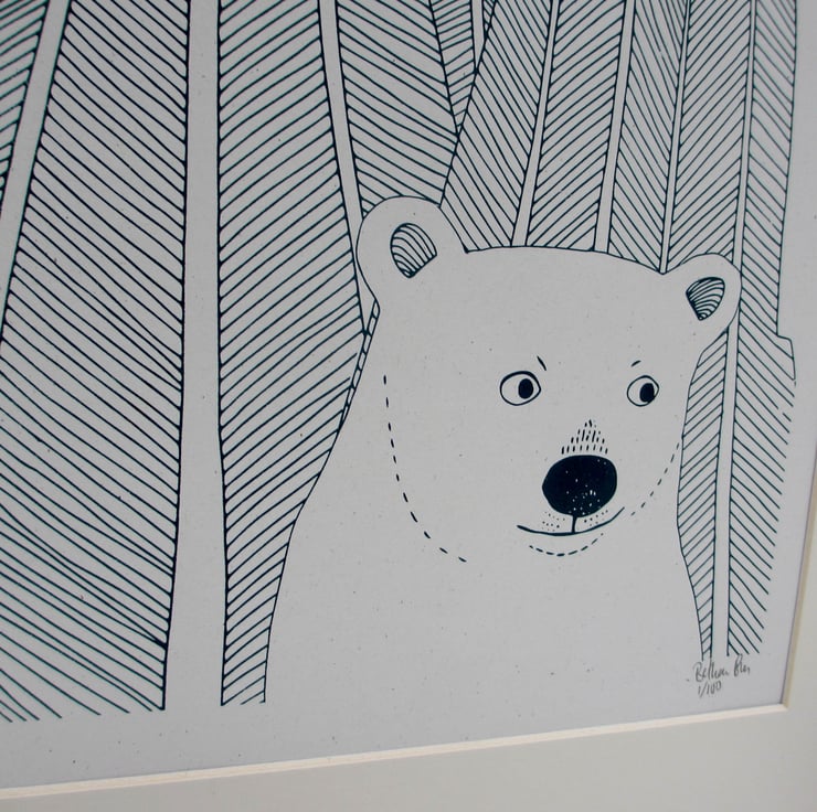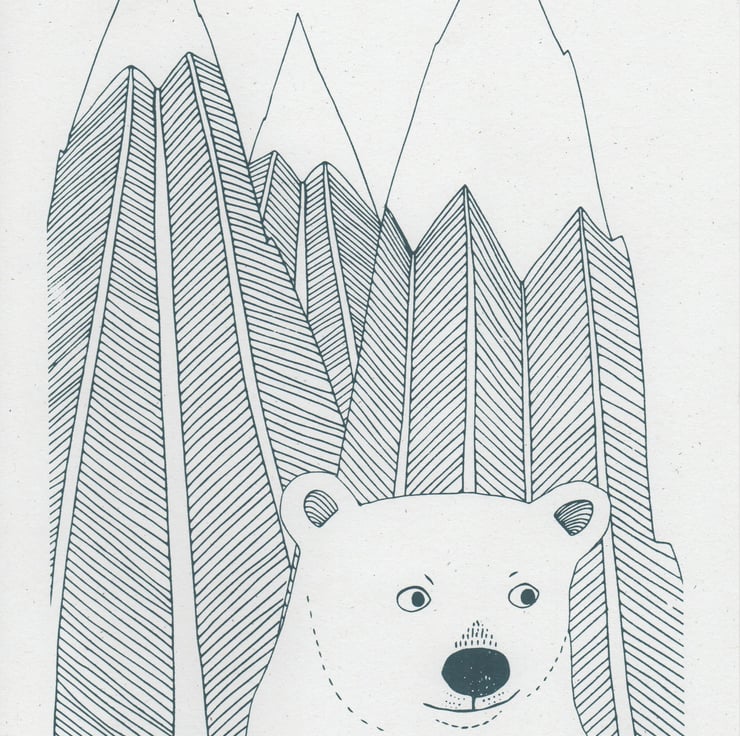 A beautiful one colour screen print (dark blue) featuring a beautiful illustration of a polar bear in front of some snowy mountains. A perfect present for any animal lover. The combination of pattern and line drawing in this illustration makes for a unique gift.