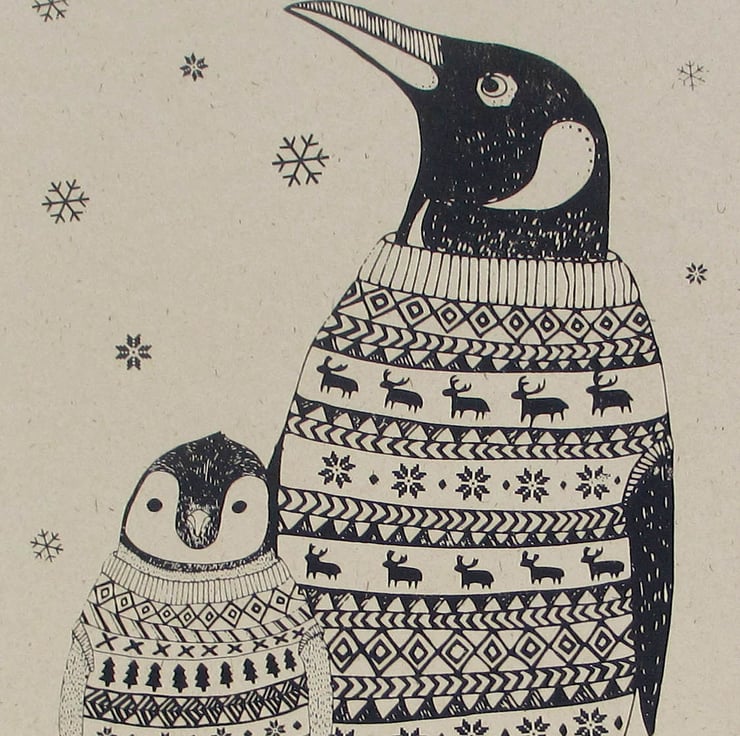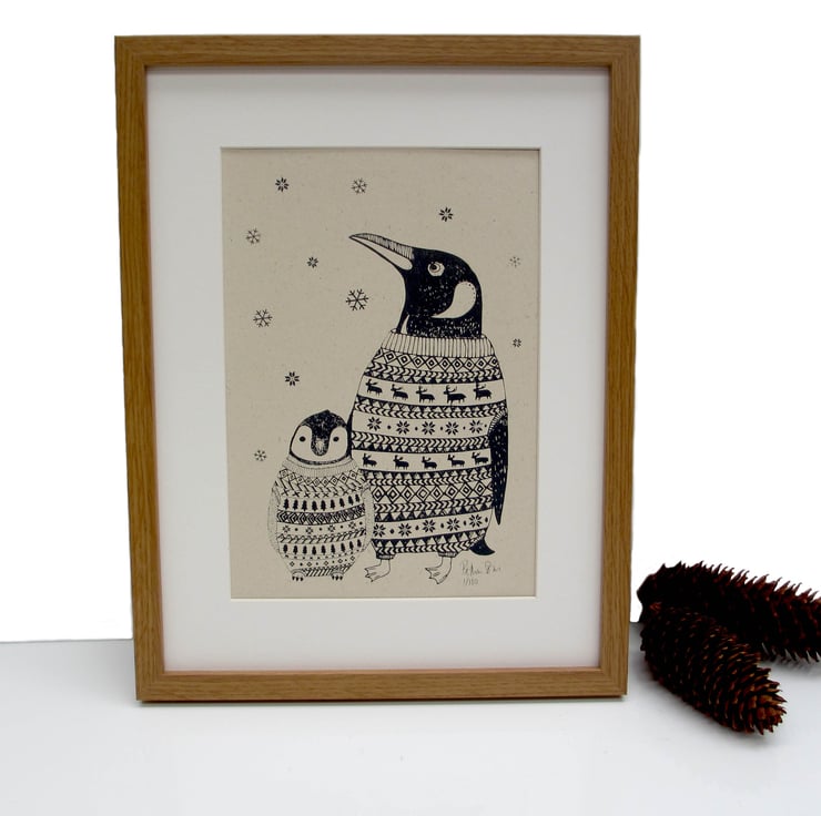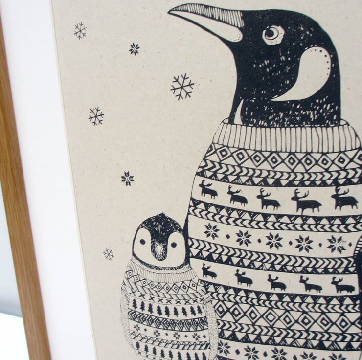 A beautiful one colour screen print (dark grey) featuring a beautiful illustration of a father and son penguin wearing their favourite sweaters!. A perfect present for any animal lover. The combination of pattern and line drawing in this illustration makes for a unique gift.