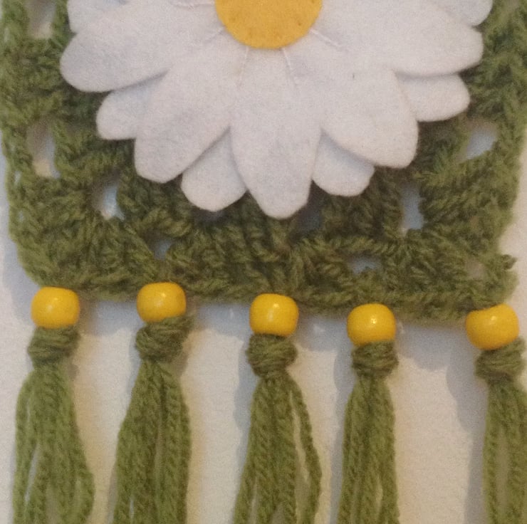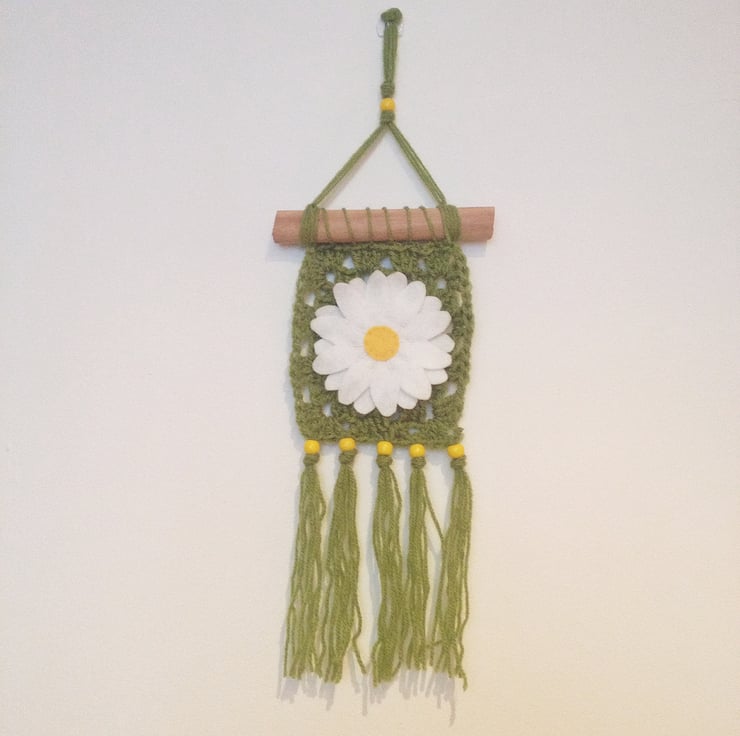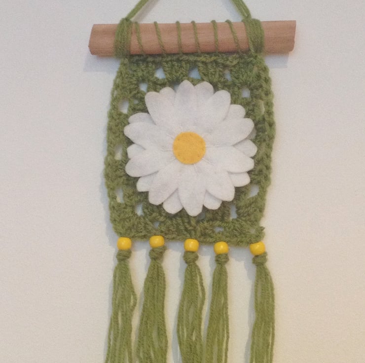 A handstitched 3D felt daisy is attached to a green crochet granny square, and hangs from a wooden dowel.