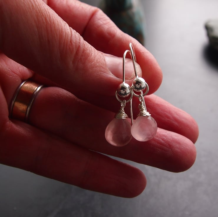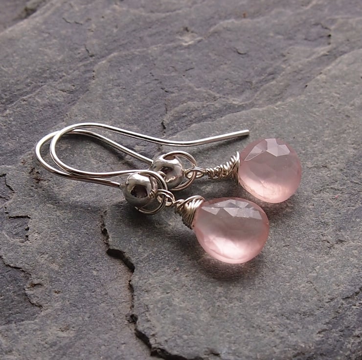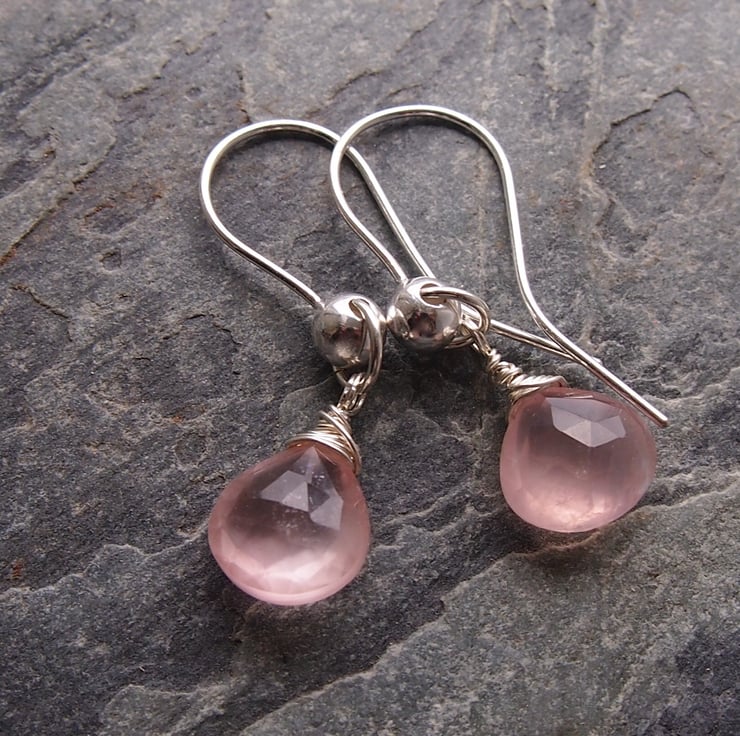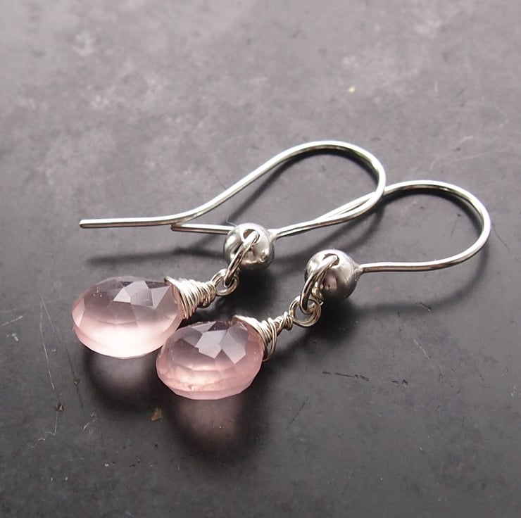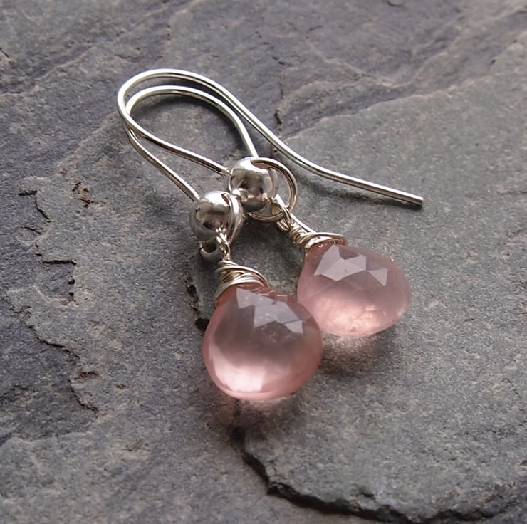 Gorgeous soft pink rose quartz drops twinkle from our own hand made earring wires.