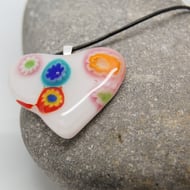 This unusual pendant has been made by fusing two layers of glass together in a kiln. This one has the addition of silver flakes sandwiched between the glass. The pendant has then been wrapped in silver plated wire with a wire woven bail. The pendant is 2.25ins (6cms) long by 1.5ins (4cms) wide and comes supplied with an 18ins (46cms) suede thong.