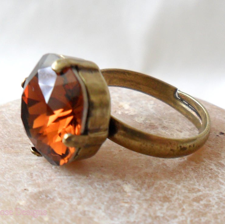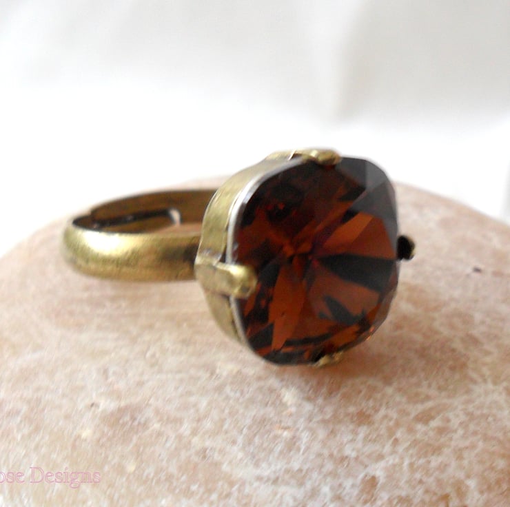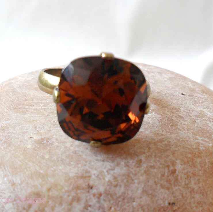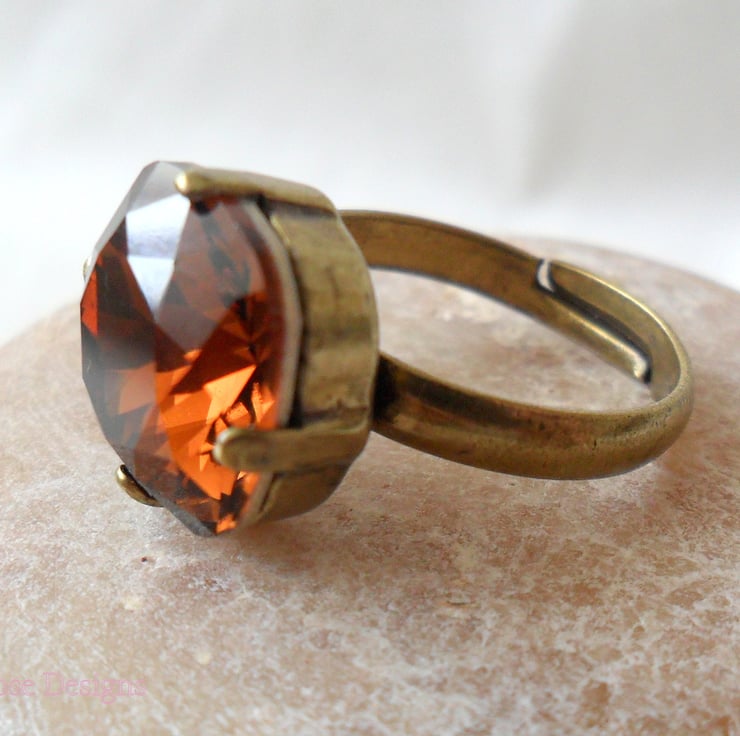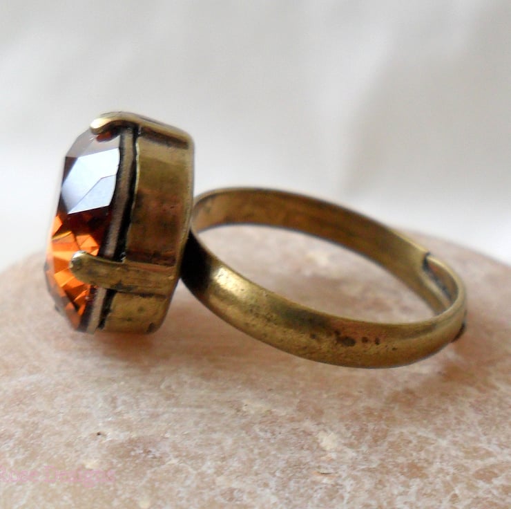 A bronze-plated ring with a 12 mm (1/2")square setting holding a Swarovski Topaze crystal - Swarovski are famous for the clarity and sparkle of their crystals. The adjustable ring setting has a lovely aged patina which perfectly complements the topaze stone.