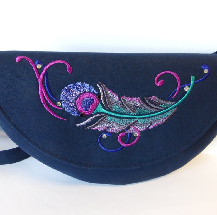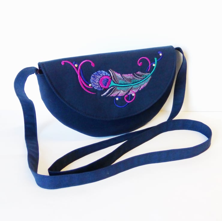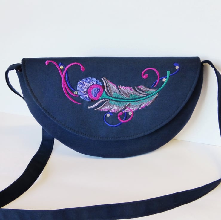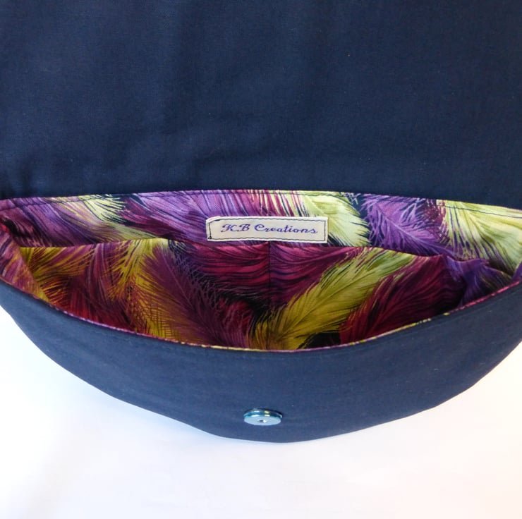 The main fabric is 100% Klona cotton in a deep navy blue, and I have embroidered a pretty feather design on the front flap in shades of purple, pink and jade green, with a few added rhinestone accents.The lining is also 100% cotton and is a pretty feather design to compliment the embroidery on the bag. There are 2 slip pockets inside, and the bag closes with a magnetic closure.