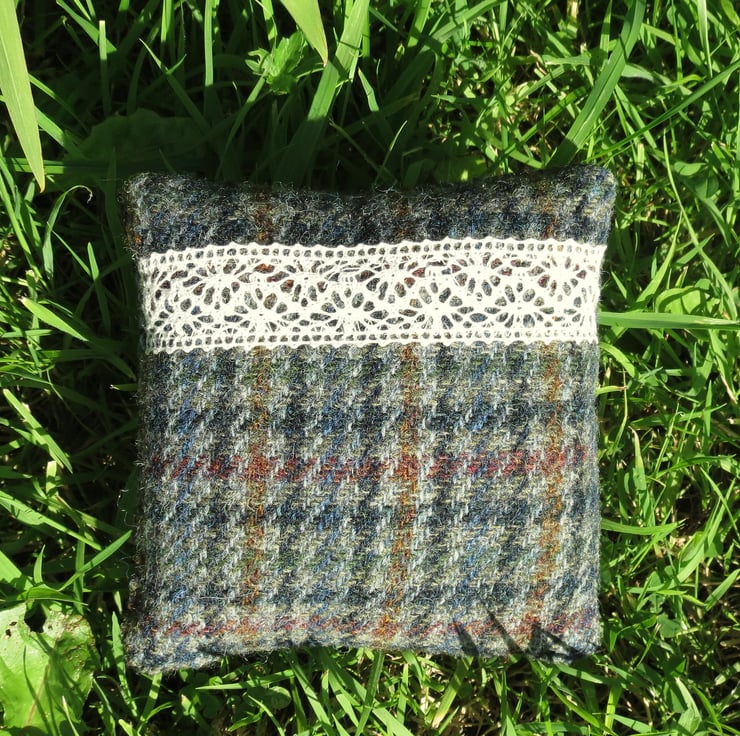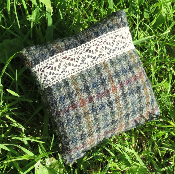 This pin cushion is made from a vintage Harris Tweed wool, with avintage lace detail.