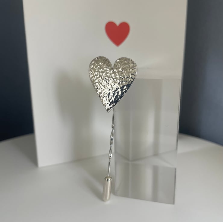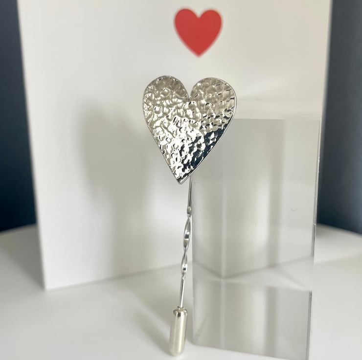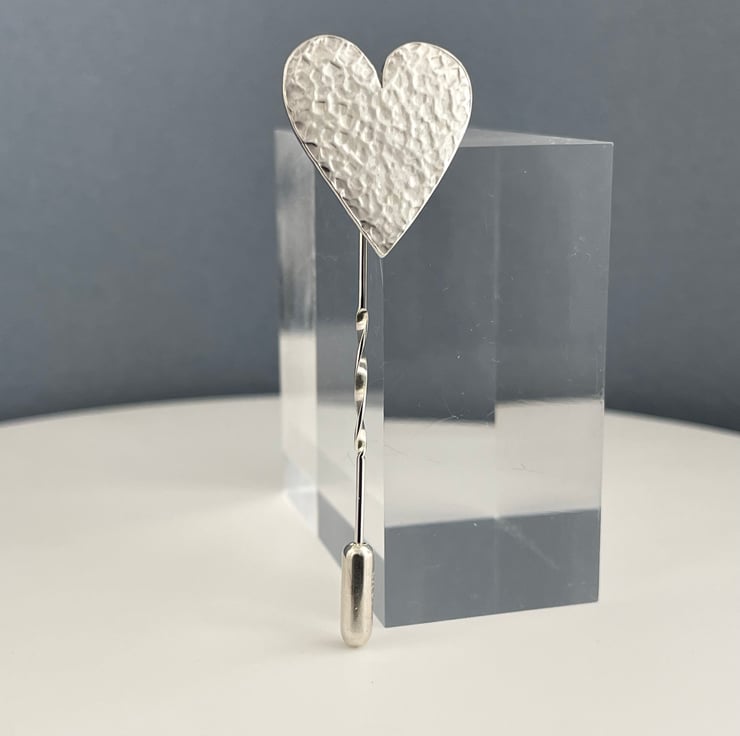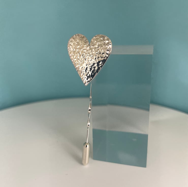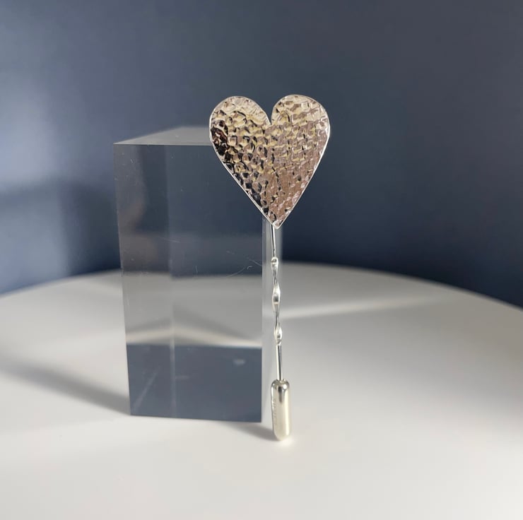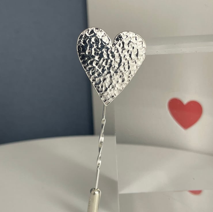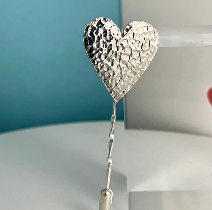 This lovely heart stick pin handmade from 925 sterling silver. Cut out by hand from solid 1mm silver sheet then hammered to create it’s unique sparkly textured surface. Set onto a twisted pin and secured with a push-on pin protector.