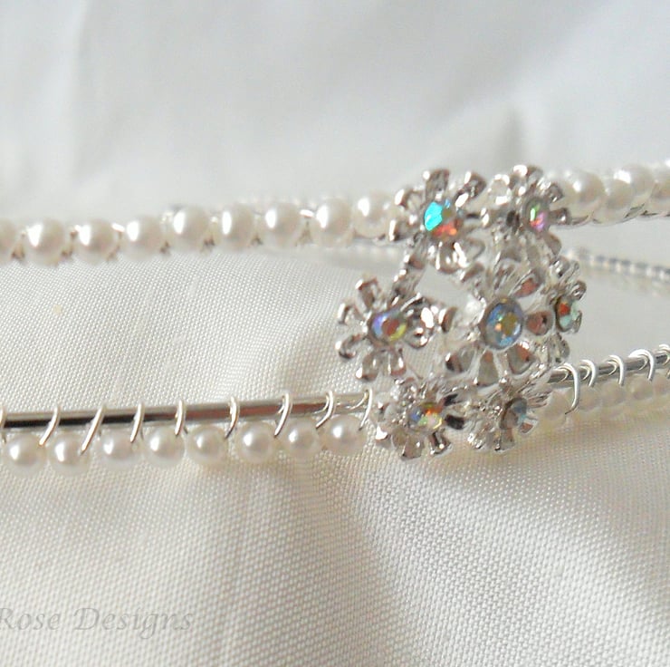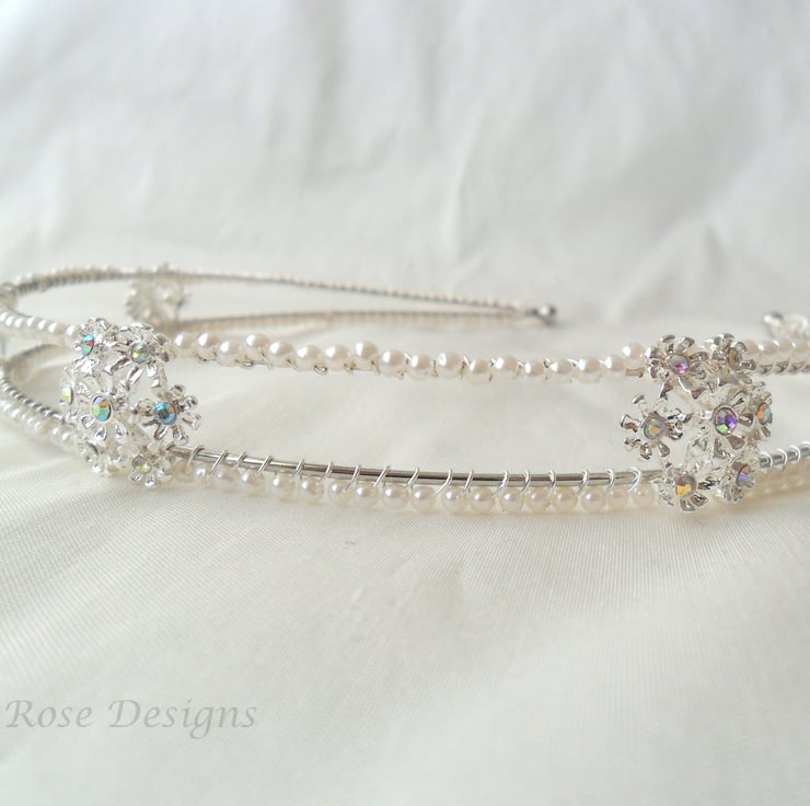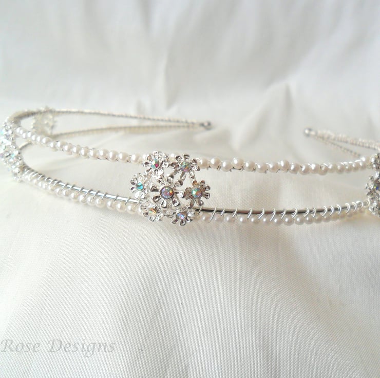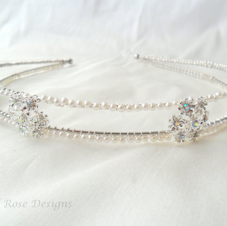 Hundreds of tiny seed pearls are wired to this slim double tiara base along with four 2 cm (3/4") diamante flowers. The diamantes are AB(Aurora Borealis) meaning that they sparkle with a rainbow of colours!