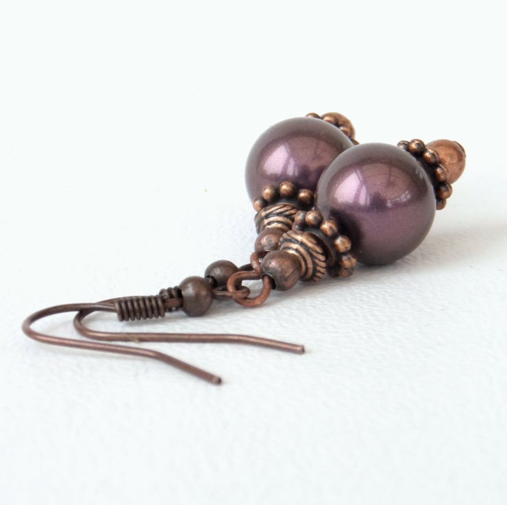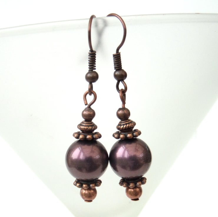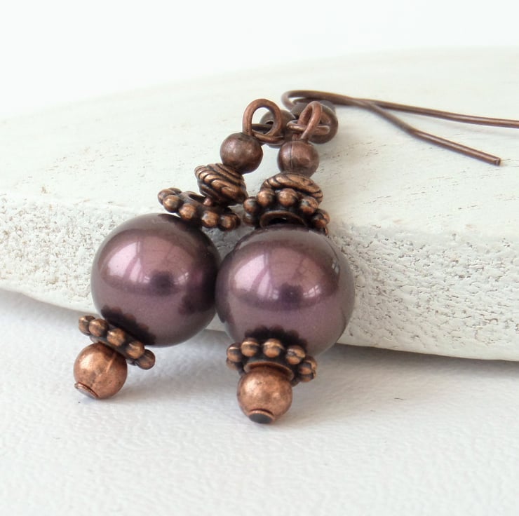 A beautiful pair of handmade earrings with copper and shell pearls, the colour of which is best described as burgundy mocha!
