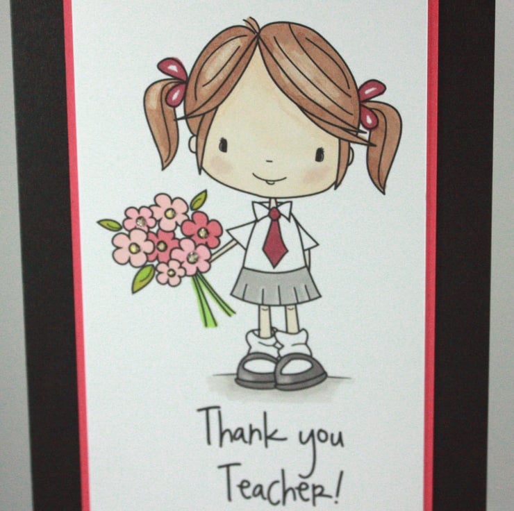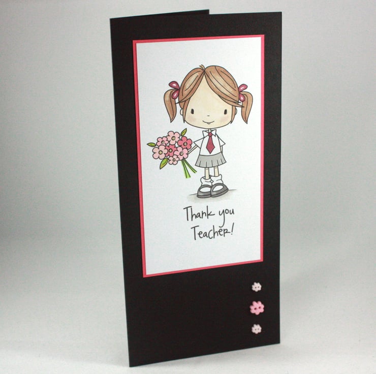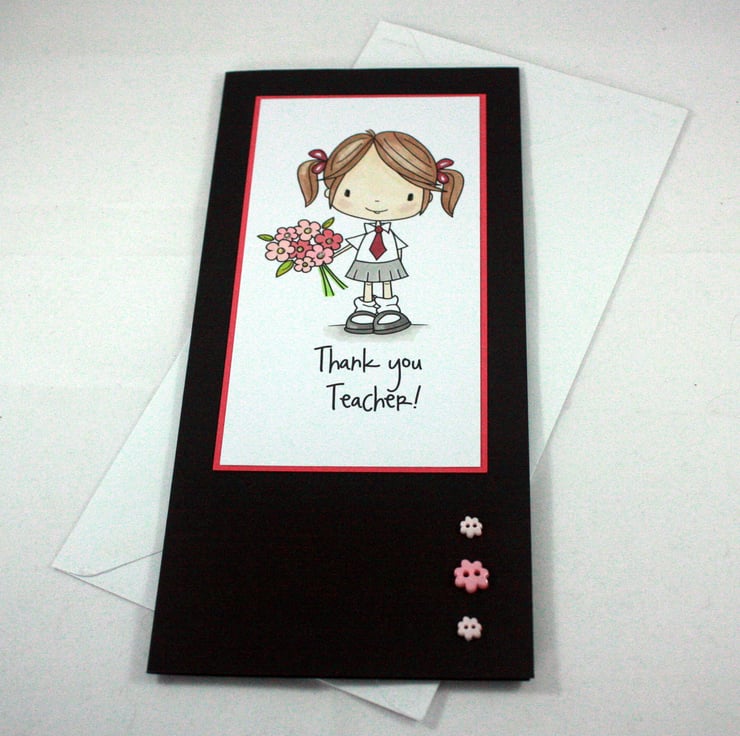 Black, teacher thank you card featuring a cute image of a schoolgirl holding a bouquet of flowers and the message 'Thank you Teacher!' The centres of the flowers have been glittered.