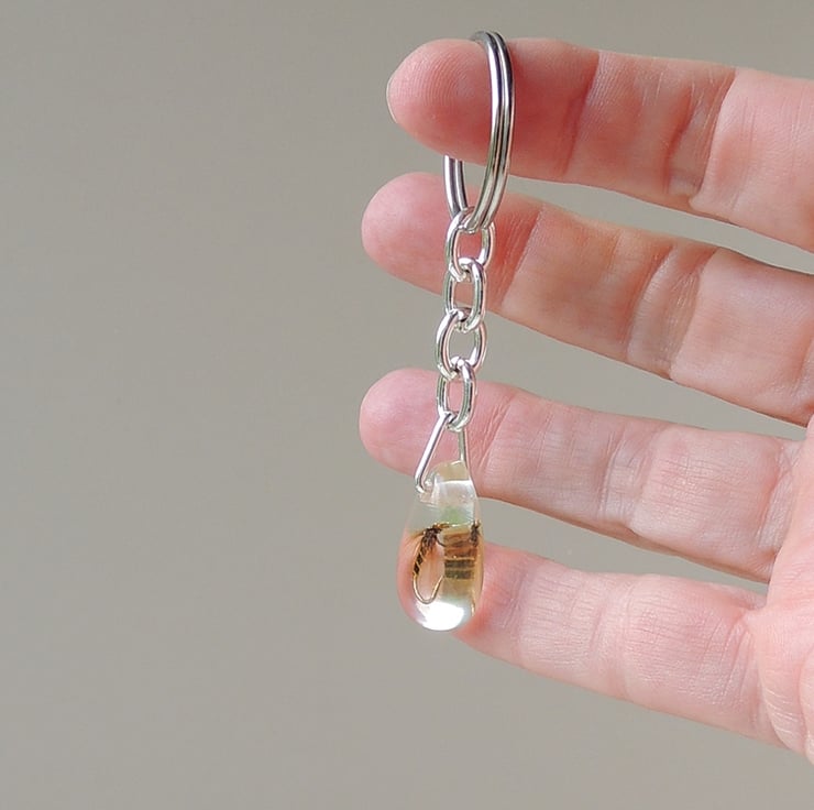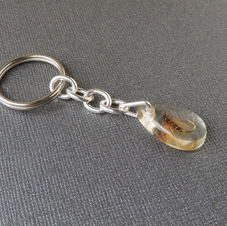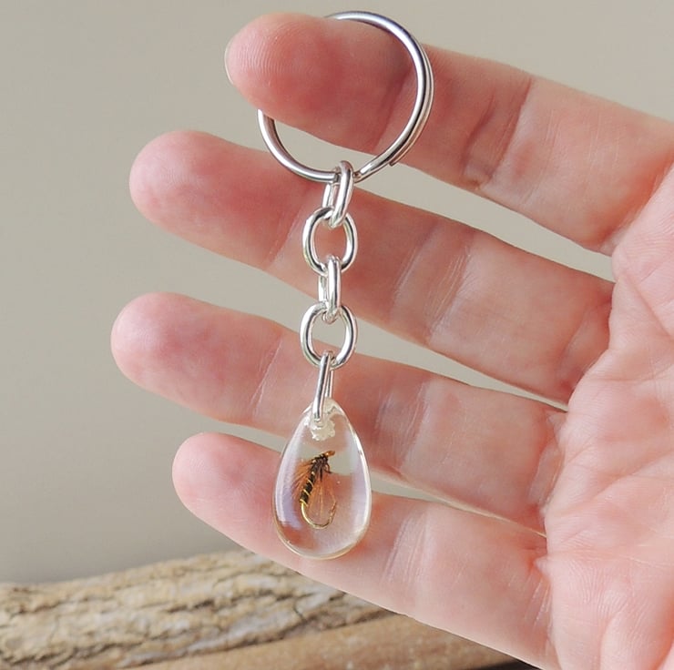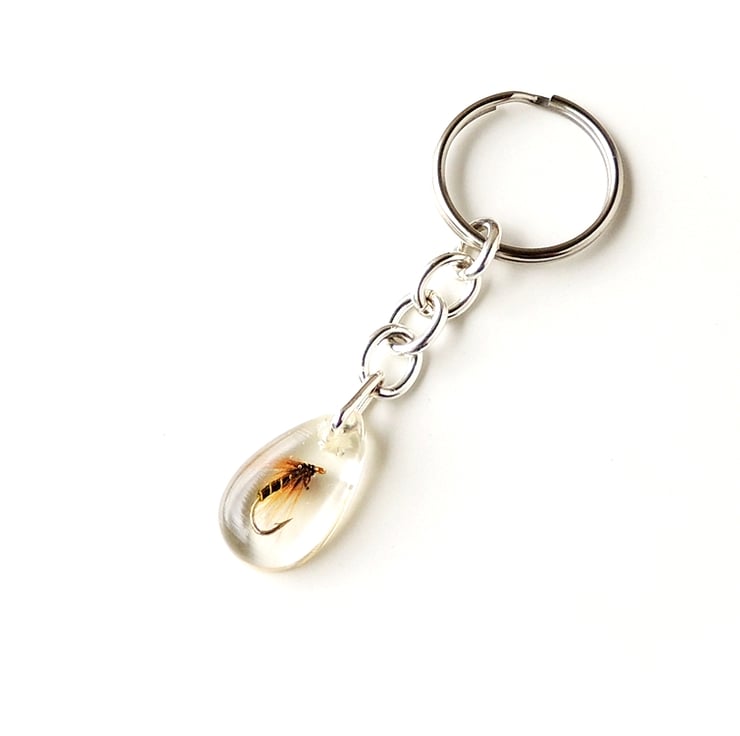This keyring has a fishing fly captured inside clear resin.