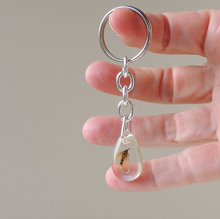 It is a small teardrop shape and measures 2.2cm x 1.3cm and is 0.5cm deep. It drops from silver plated chain and the whole keyring measures 7.5cm from the top of the keyring to the bottom of the fishing fly in resin.