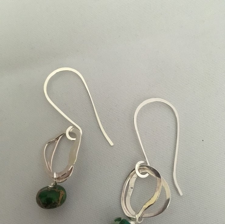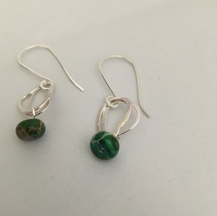 Sterling silver ear hooks and loops with green impression jade stones.