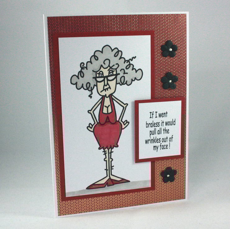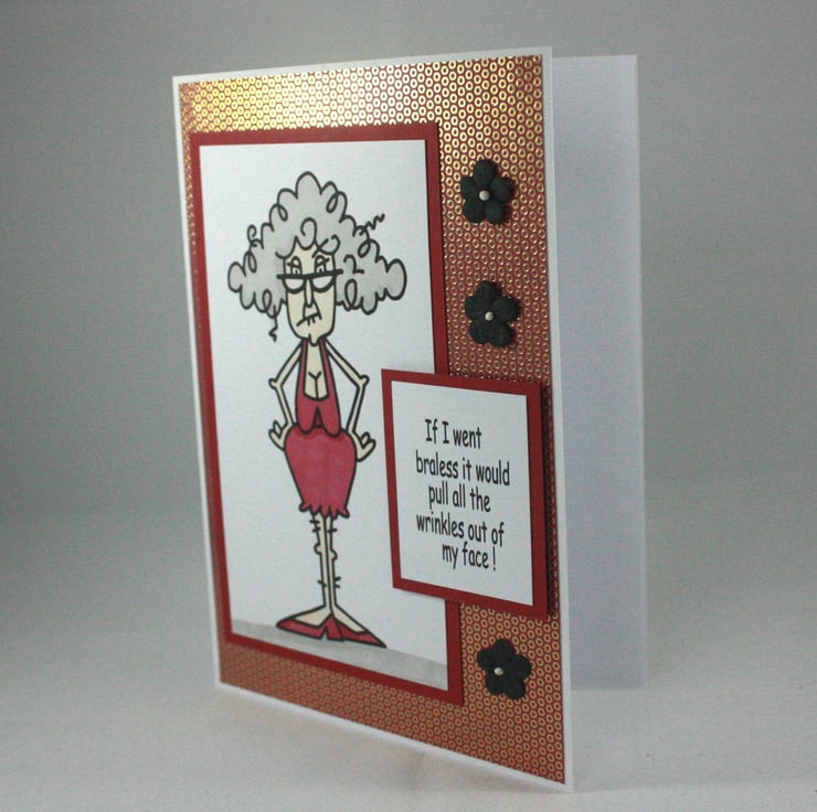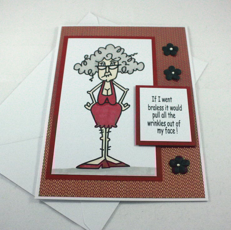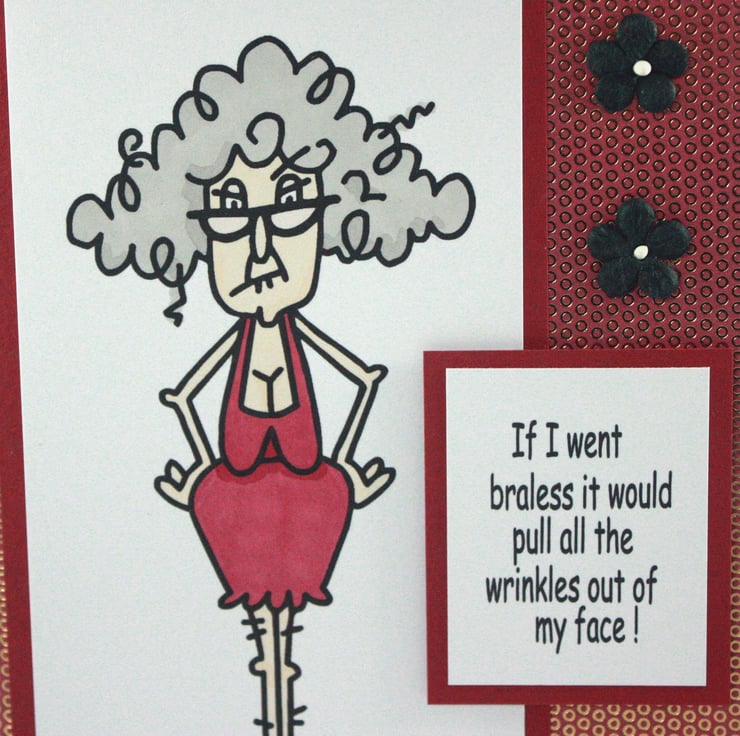 Birthday card for female friends or relatives with a sense of humour. The card features a coloured image of an older lady with the message: 'If I went braless it would pull all the wrinkles out of my face!'. The image is layered onto a pink and gold patterned background and finished with 3 black paper flowers.