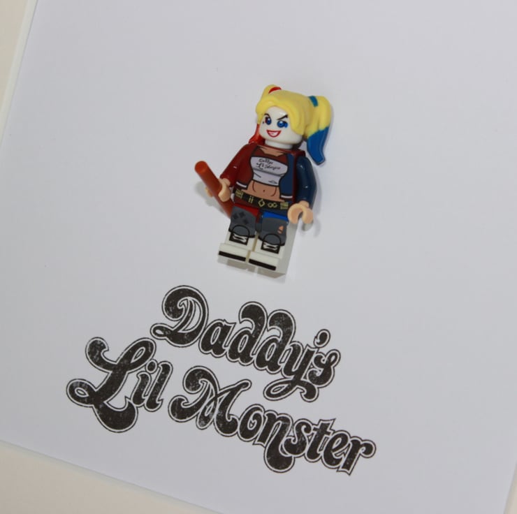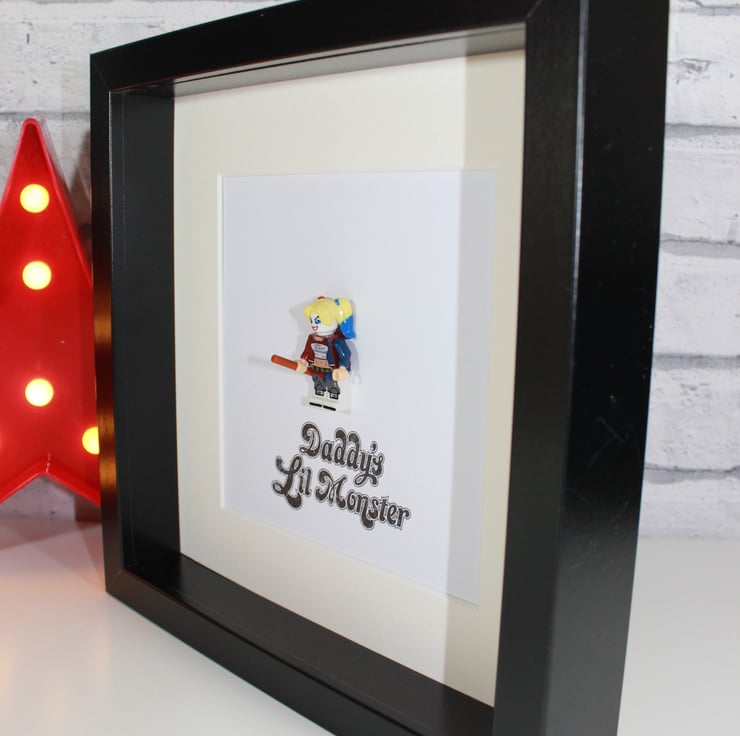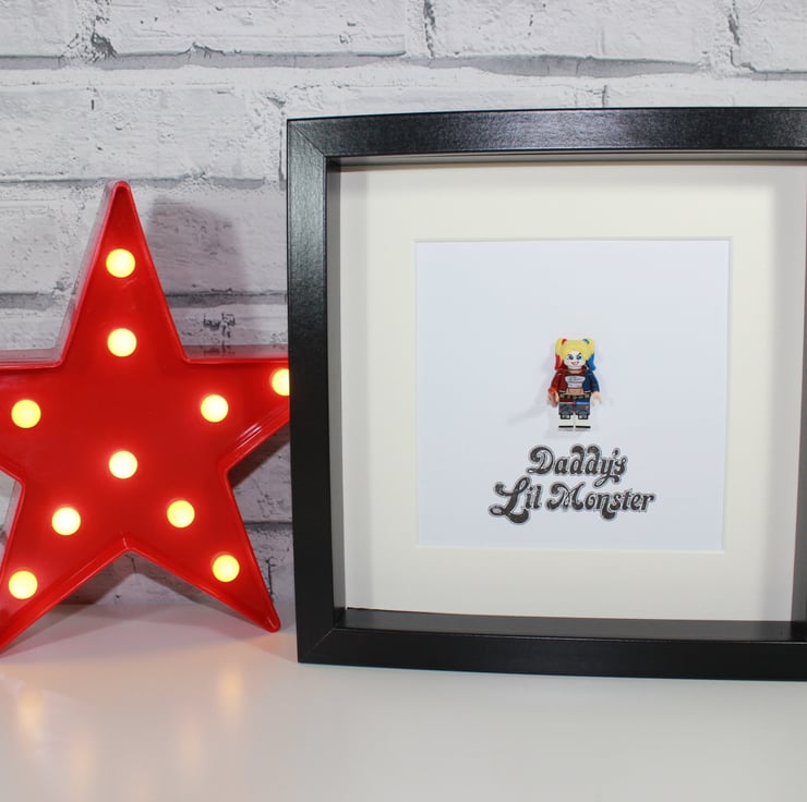 To celebrate the upcoming release of Suicide Squad we have a given Harley Quinn the full framedup treatment. Portrayed by Margot Robbie in the movie this crazy little lady comes complete with her trademark make up, coloured hair and an awesome costume to match! We have mounted this minifigure in to a deep box frame and printed "Daddy's Lil Monster" underneath, matching her t-shirt.