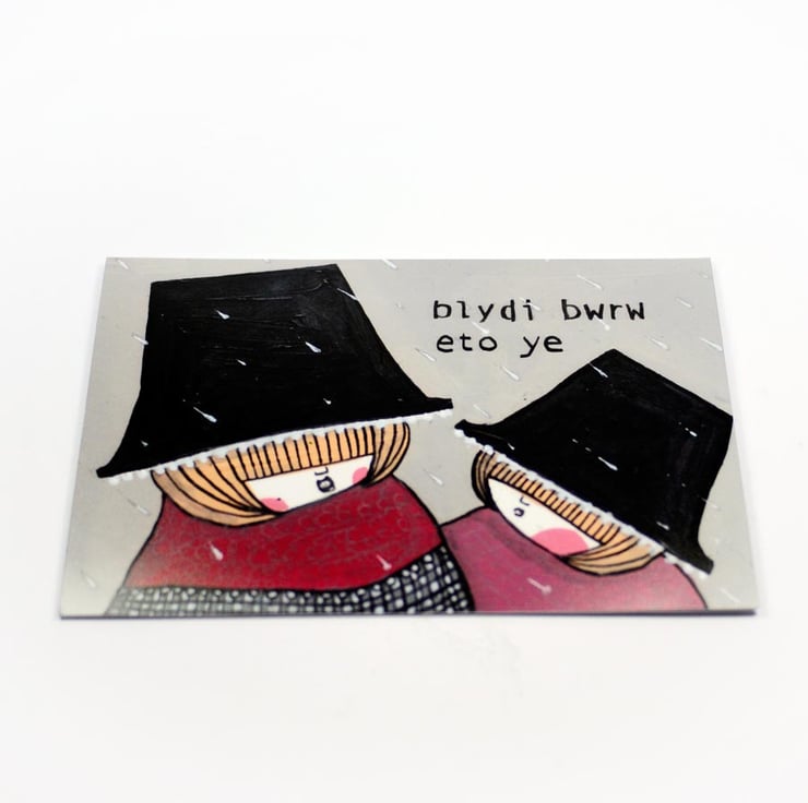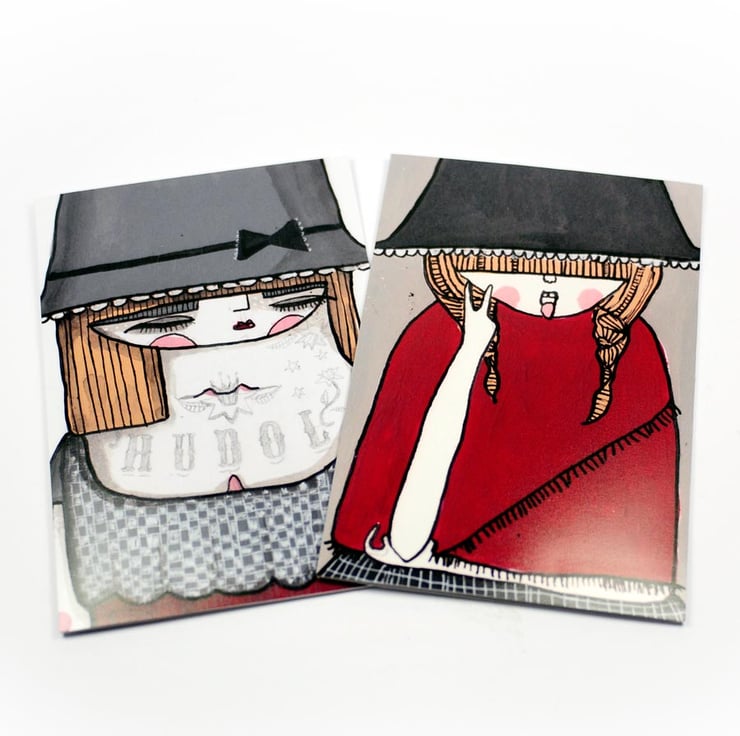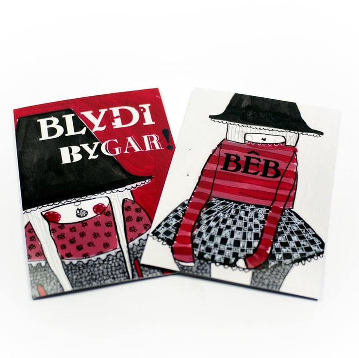 This listing is for a set of 5 Twinkle & Gloom Welsh lady themed cards. The cards feature a print of Twinkle & Gloom illustrations that have been assembled into cards by hand. The image is printed onto matte photo paper and secured onto white card stock, discreetly stamped on the back. This set features the following designs:
